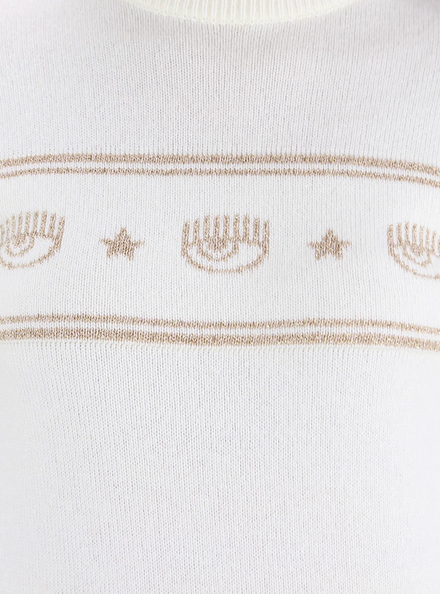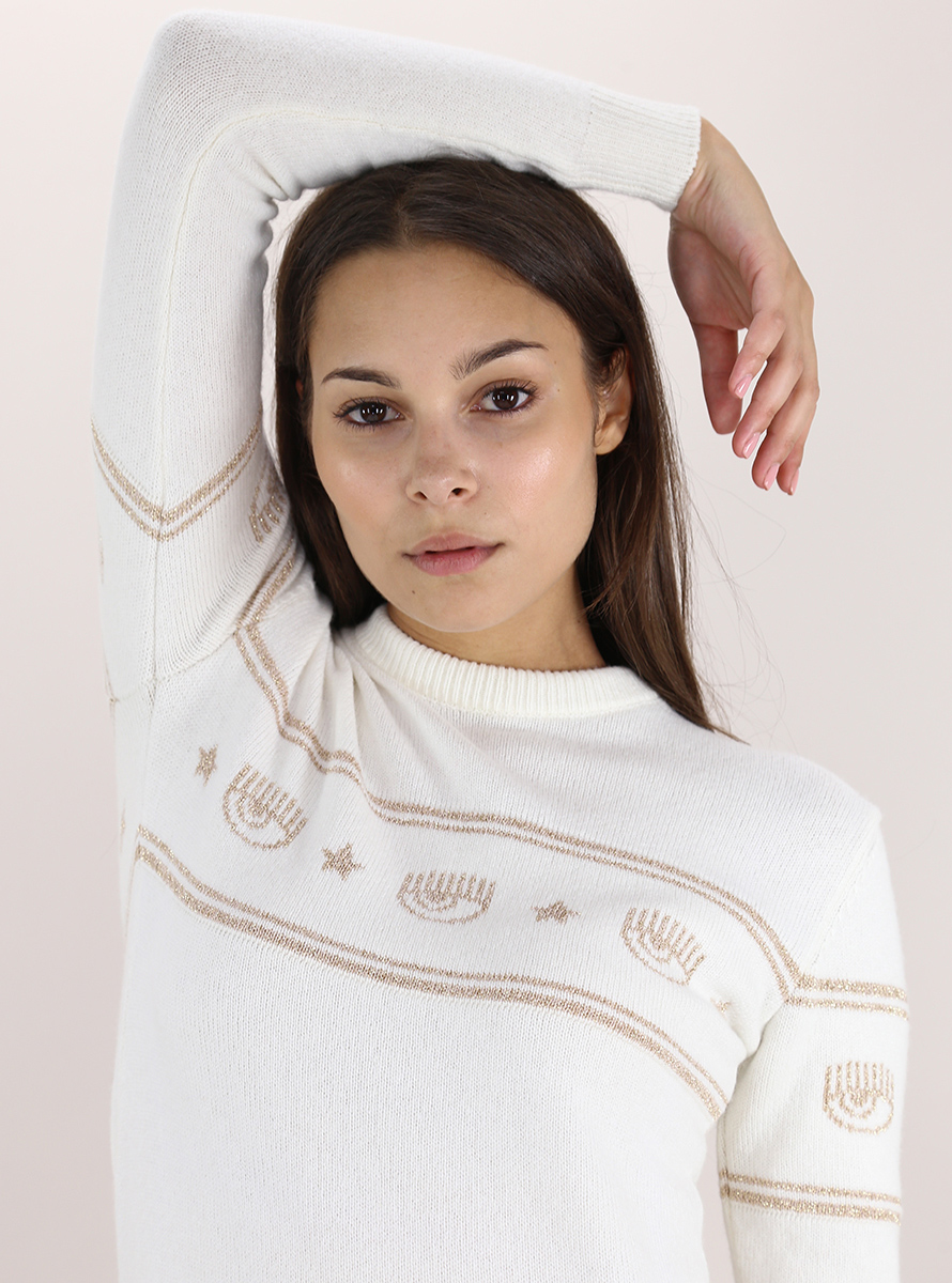 Chiara Ferragni dress in wool blend. Long sleeves and round neck. Front and back lurex logo embroidery. The model is 1.75 tall and wears size XS.