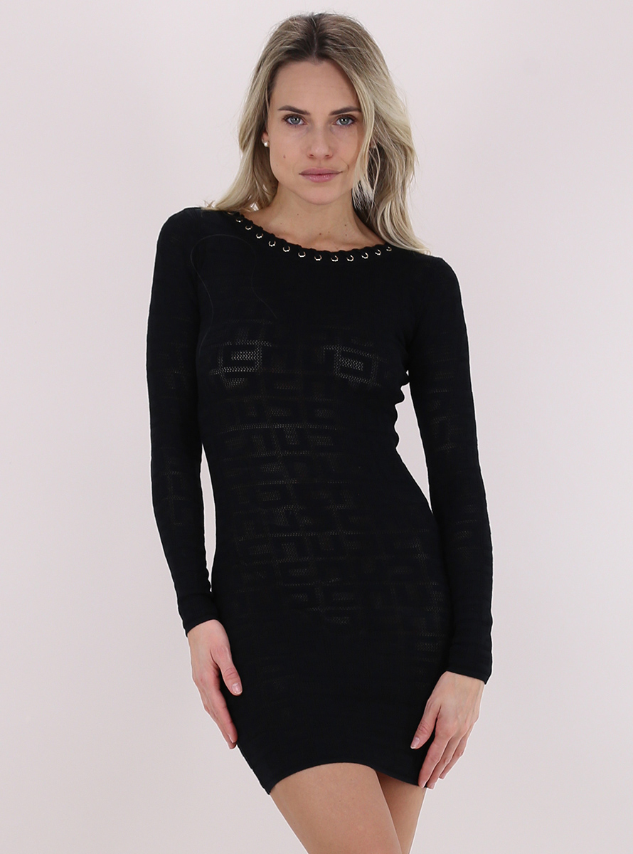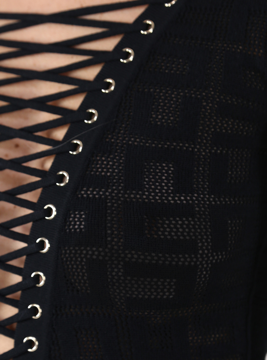 Elisabetta Franchi dress in stretch viscose blend with long sleeves and round neck. Plunging neckline with gold eyelets and braided laces. Tone-on-tone Monogram pattern in mesh stitch. The model is 1.68 tall and wears size 40.