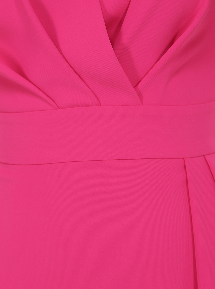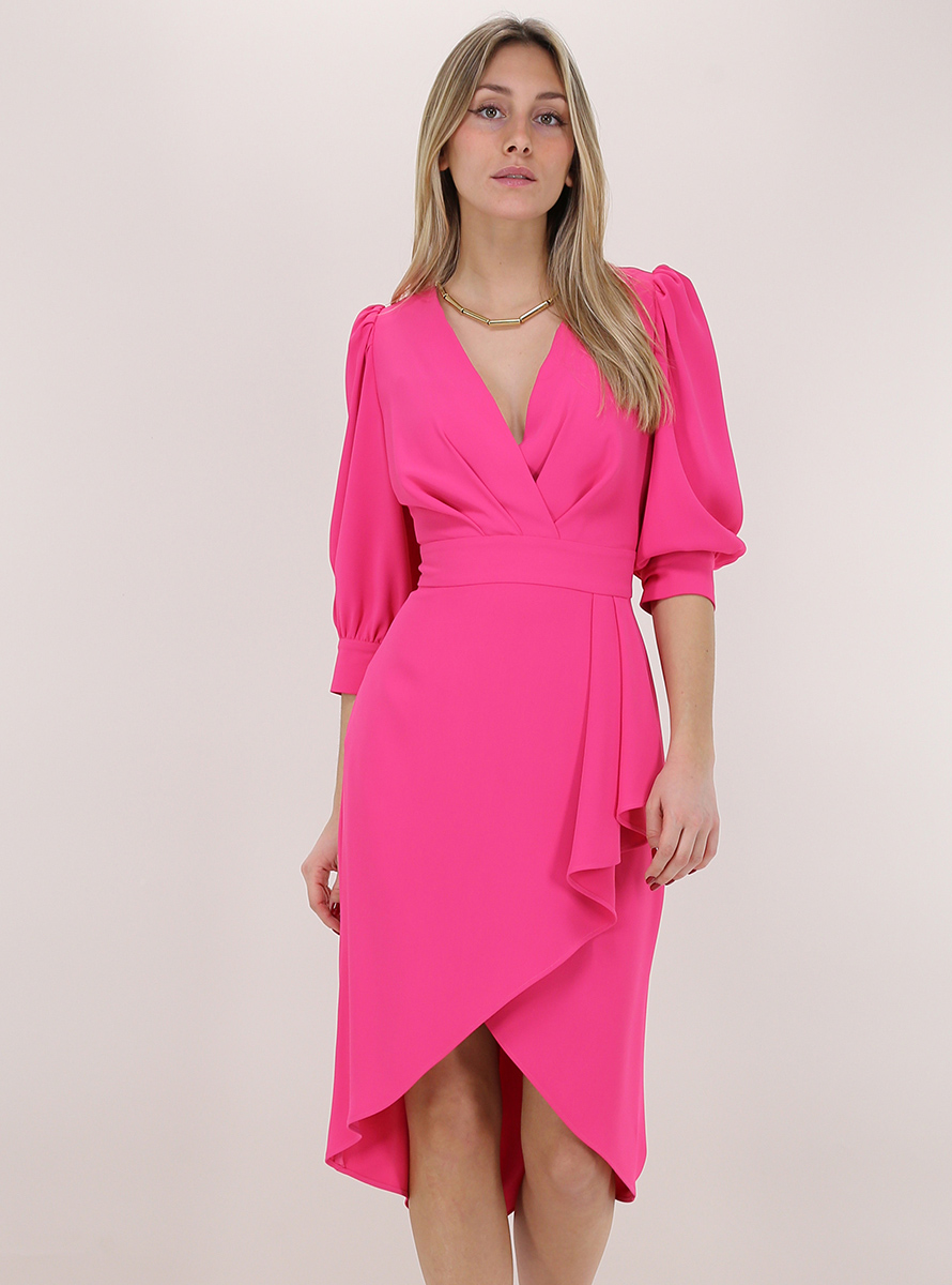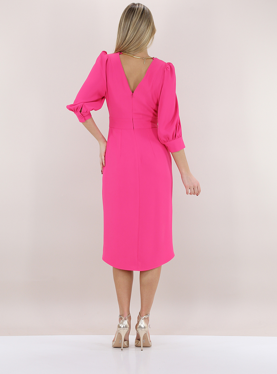 Hanita dress with 3/4 sleeves with cuffs and front and back V-neck. Skirt with pleats and asymmetrical hem. Back zip closure and metal necklace included. The model is 1.75 tall and wears size XS.