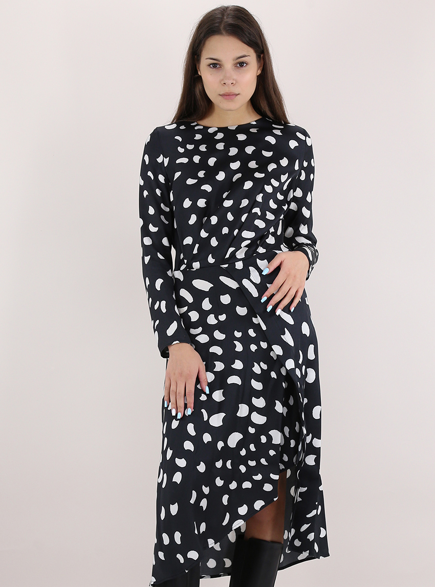 Manila Grace dress in viscose. Long sleeves and round neck. Pleats at the waist with asymmetric panel on the bottom. Button closure on the back and side zip. The model is 1.75 tall and wears size 38.