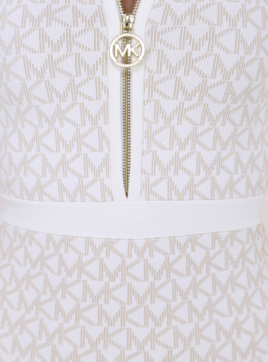 Michael Kors dress in stretch viscose blend. Polo neck with gold logoed front zip closure. Flared bottom. Monogram pattern. The model is 1.75 tall and wears size XS.
