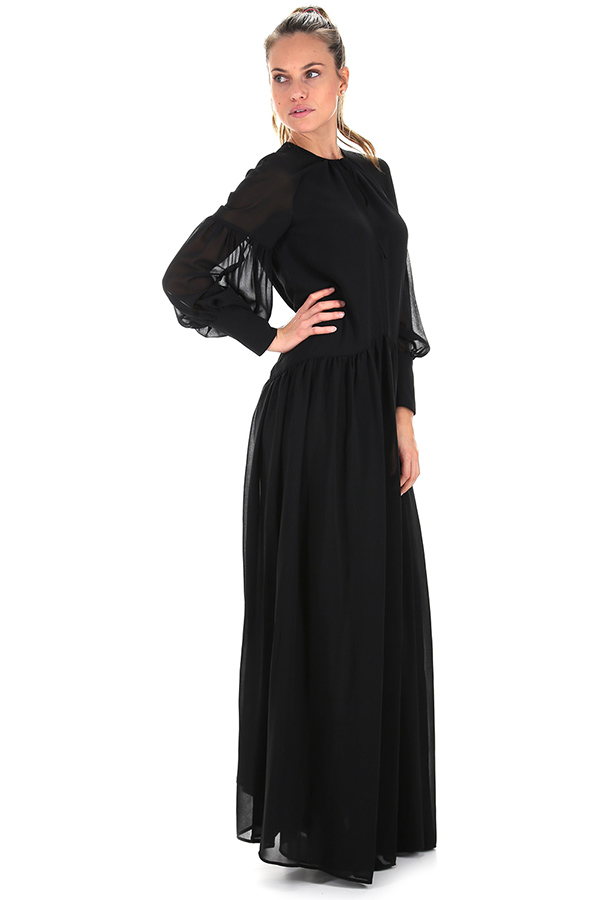 Abito lungo con manica ampia e bottoncini sui polsi. Scollo a V e lacci di chiusura sul davanti.