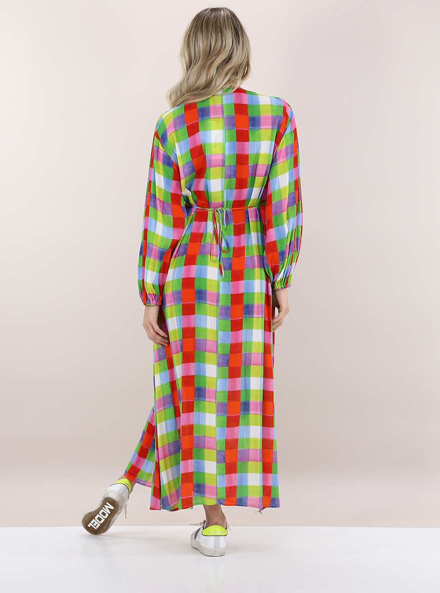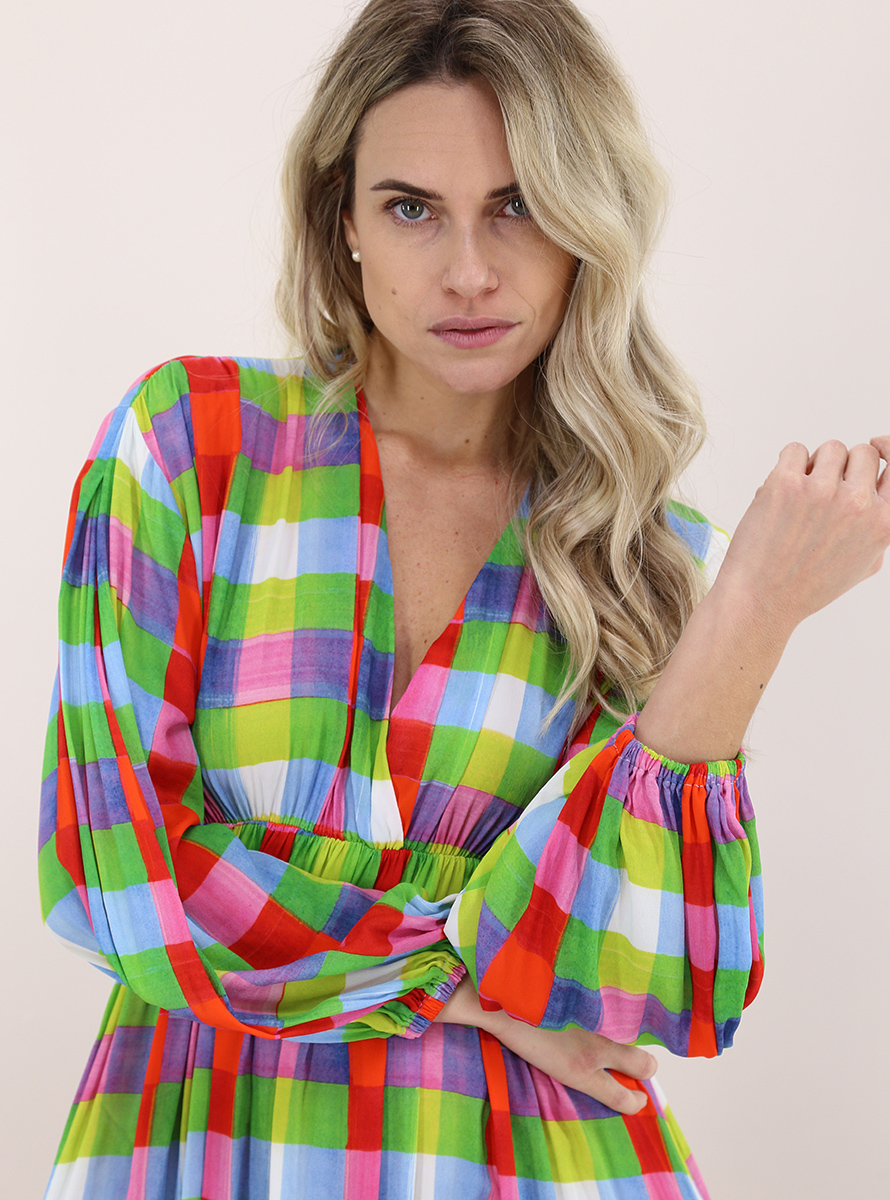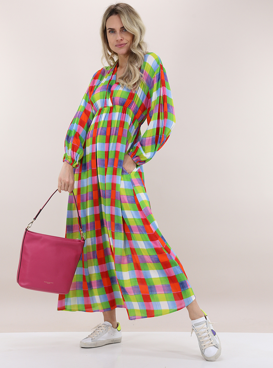 Loose Semicouture dress in viscose with long sleeves and elastic bands on the bottom. V-neckline and front elastic waist. Side pouch pockets and fabric closure strap on the back. Multicolor check pattern. The model is 1.68 tall and wears size 40.