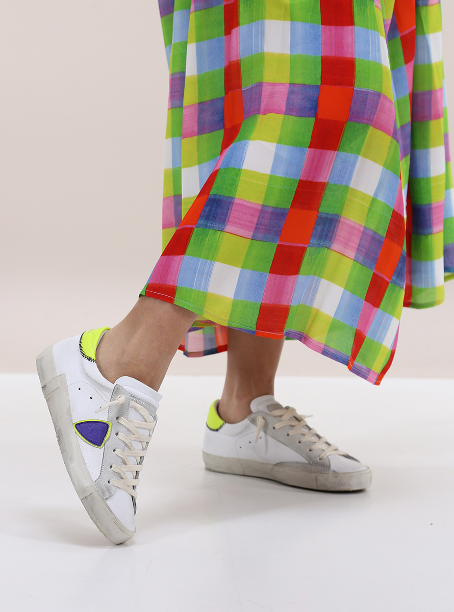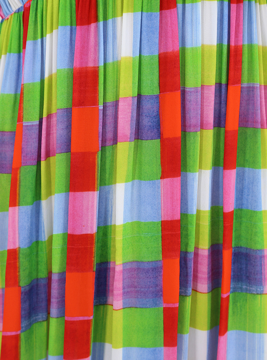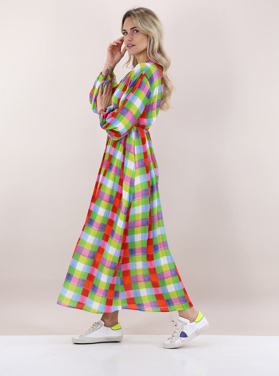 Loose Semicouture dress in viscose with long sleeves and elastic bands on the bottom. V-neckline and front elastic waist. Side pouch pockets and fabric closure strap on the back. Multicolor check pattern. The model is 1.68 tall and wears size 40.