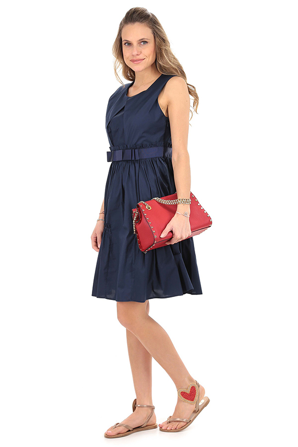 Abito in cotone senza maniche e scollo rotondo, arricciatura in vita. Cintura e fiocchetto di canetè, chiusura laterale da zip invisibile. La modella è alta 1,68 ed indossa la taglia 40.