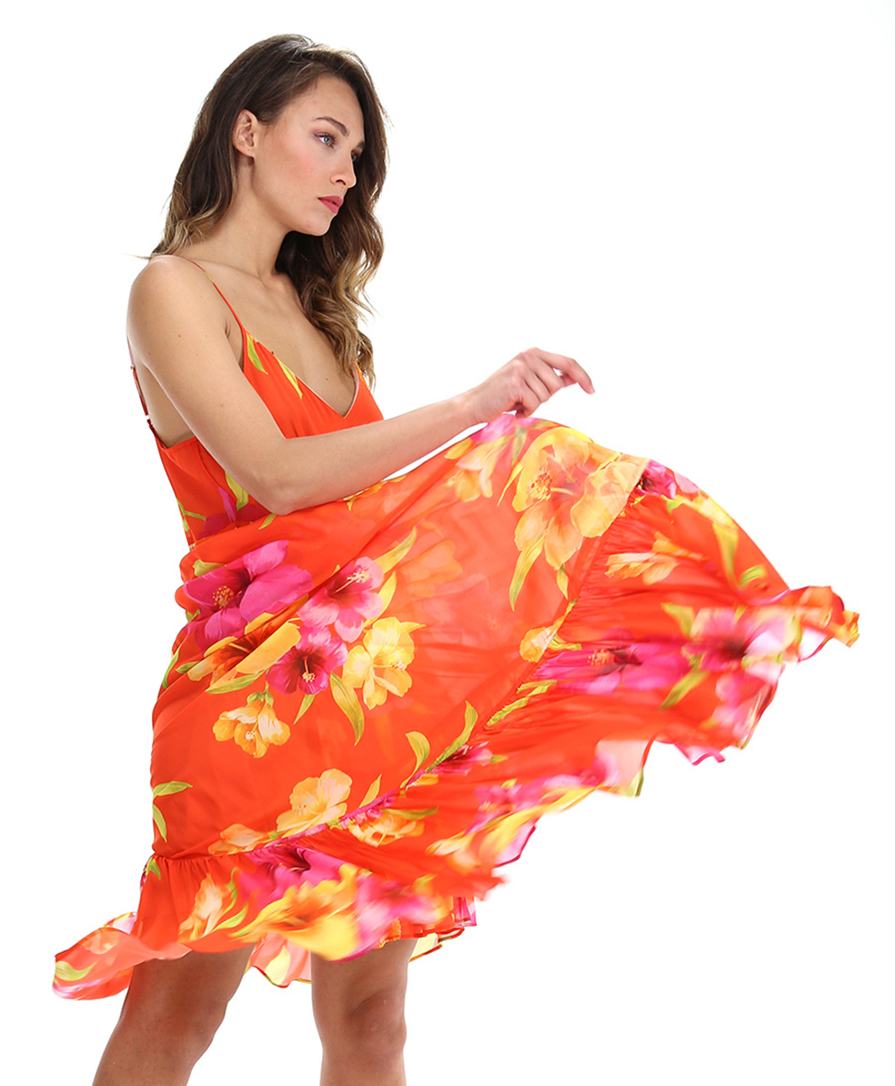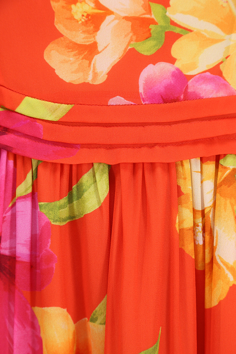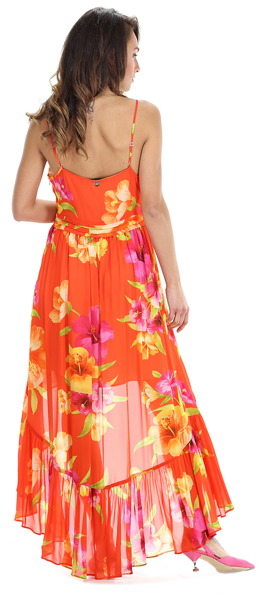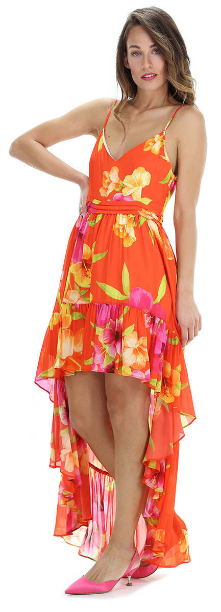 Slip dress lined in viscose with asymmetric hem. Side zip closure. Floral fantasy. The model is 1.80 tall and wears size 42.