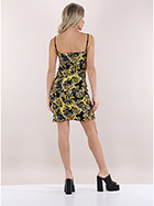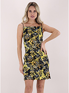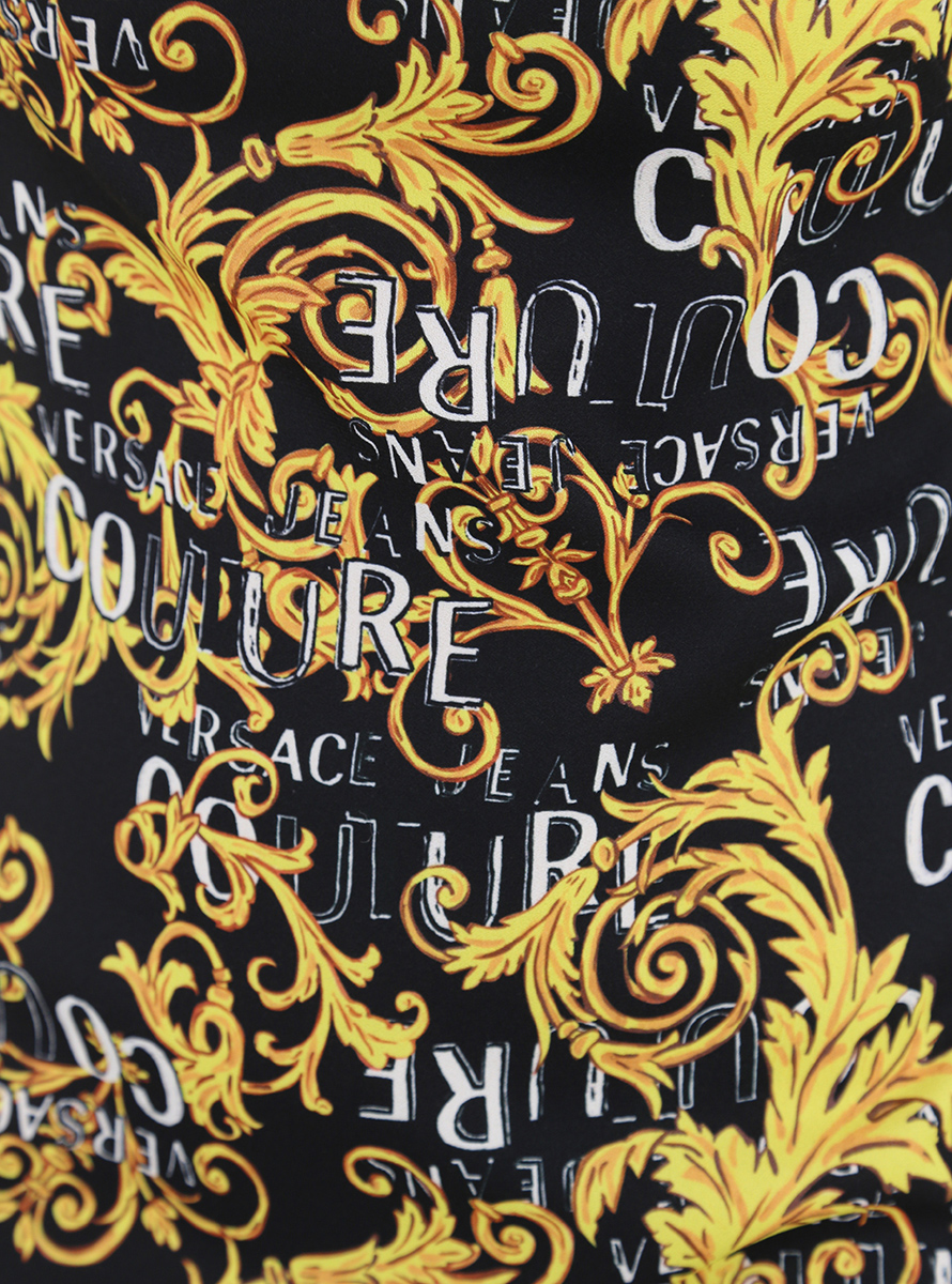 Versace Jeans Couture slip dress with front and back square neckline. Slits on the bottom and side zip closure. Baroque logo pattern. The model is 1.68 tall and wears size 38.