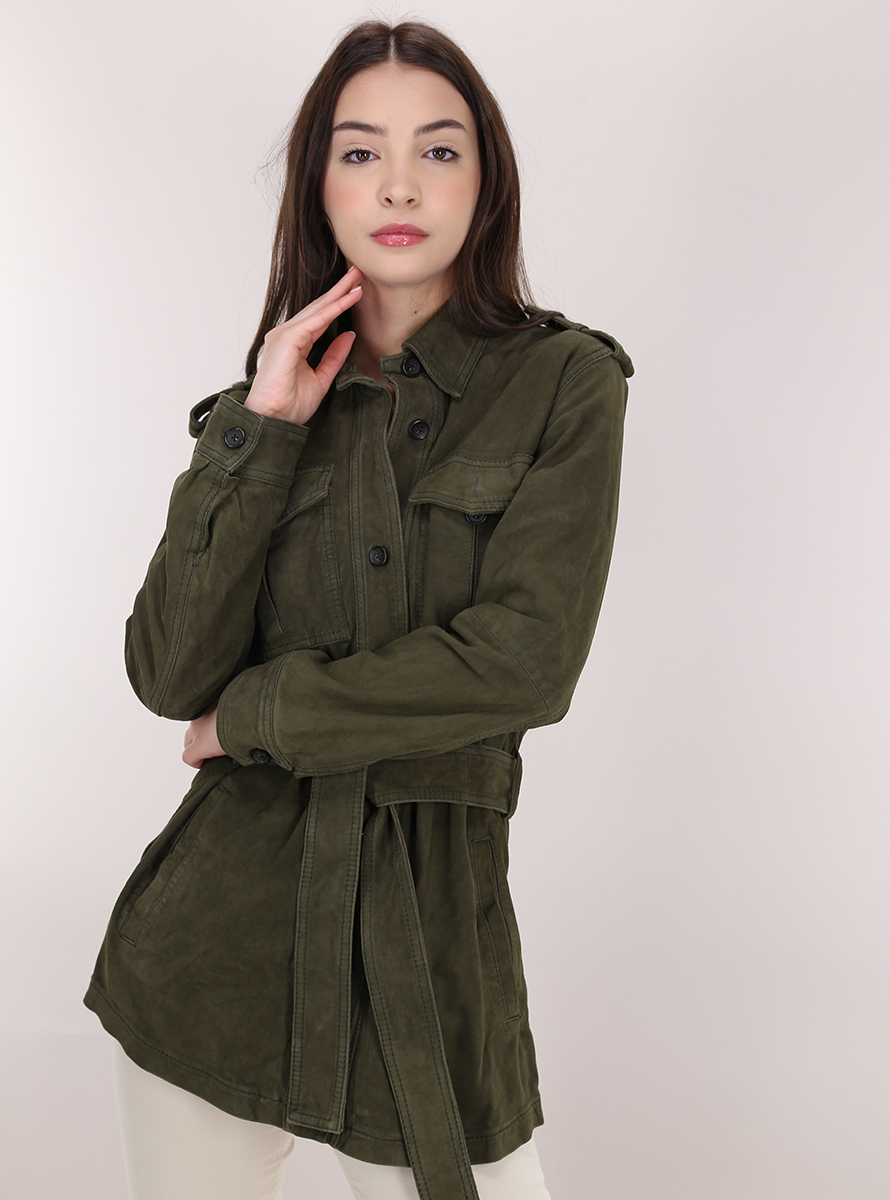 Giacca militare Andrea D'Amico in camoscio. Maniche lunghe e collo classico. Cintura in camoscio inclusa. La modella è alta 1,70 ed indossa la taglia 40.