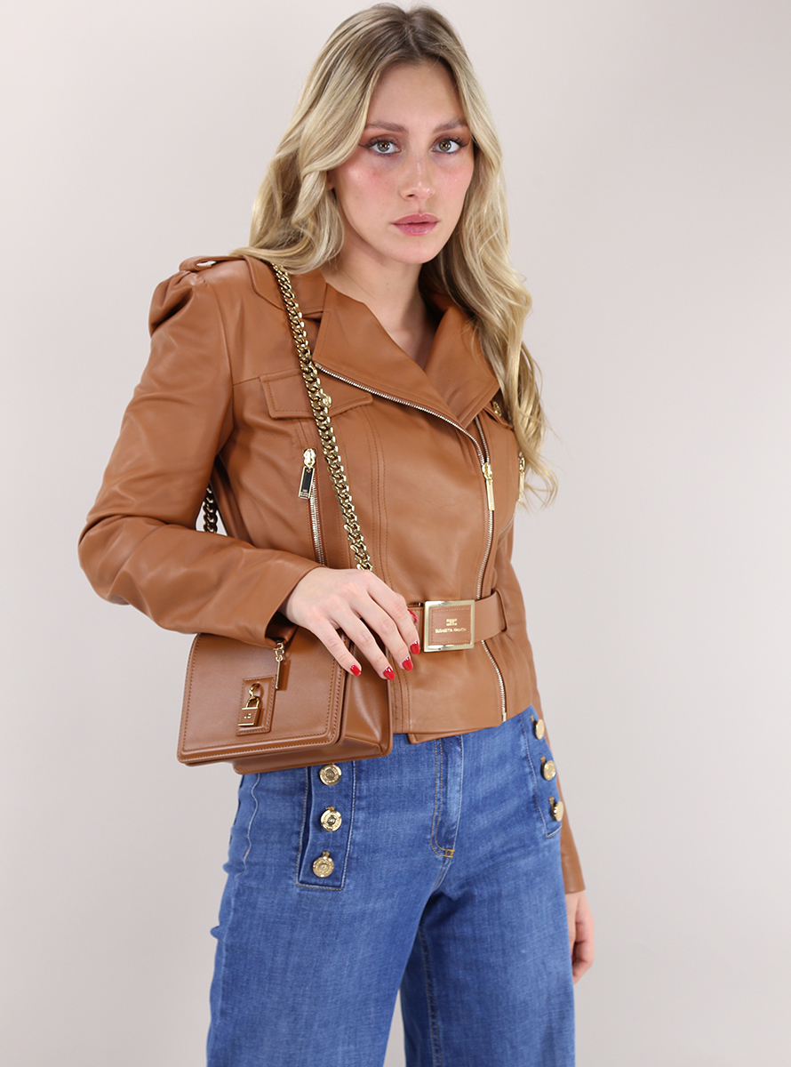 Chiodo Elisabetta Franchi in pelle foderata a maniche lunghe e spalle arricciate con mostrine. Collo a reverse e tasche con zip frontali. Cintura in pelle logata gold inclusa. La modella è alta 1.70 ed indossa la taglia 40.