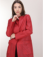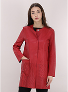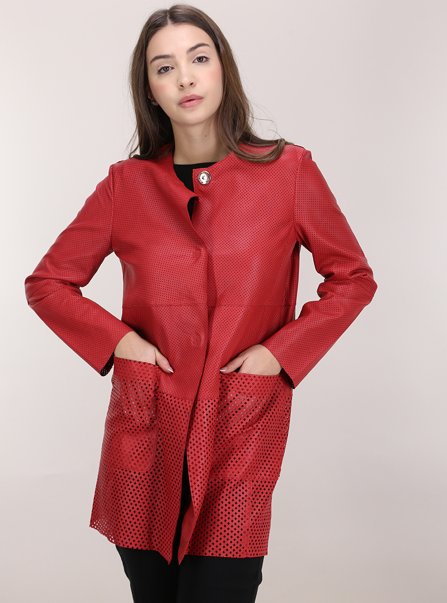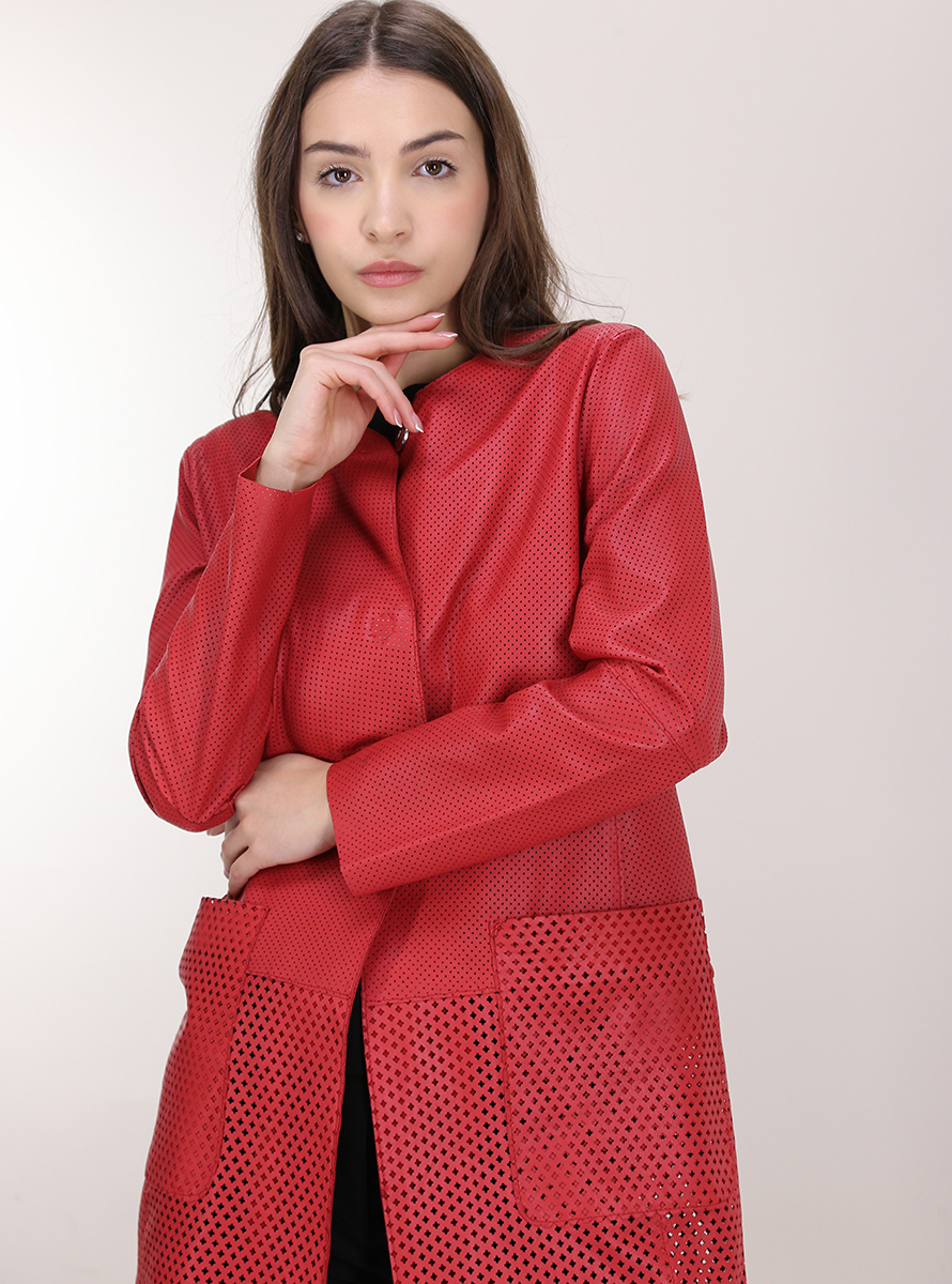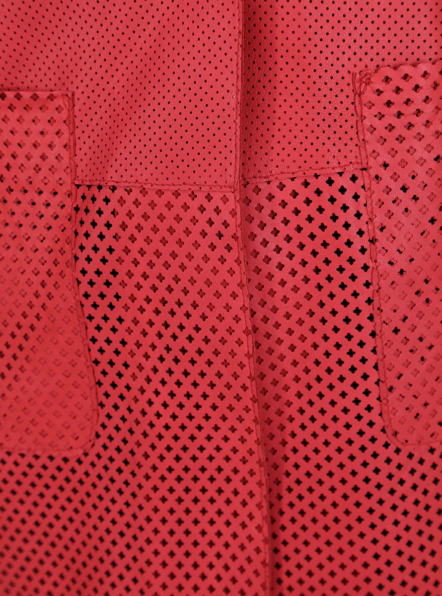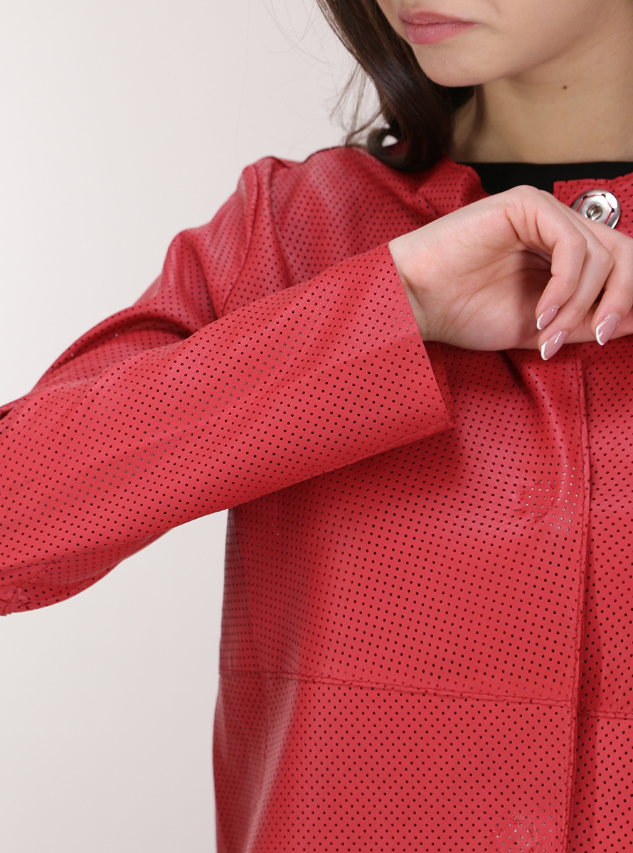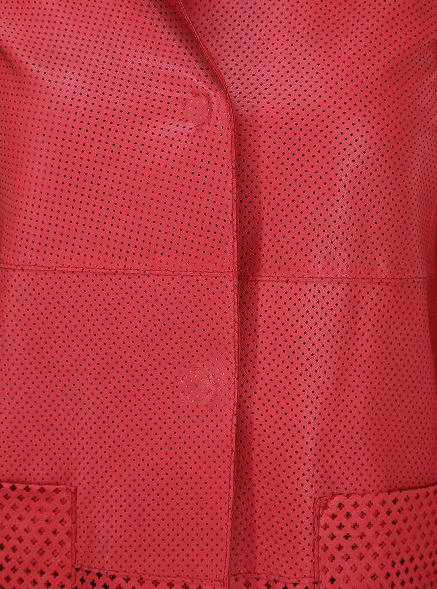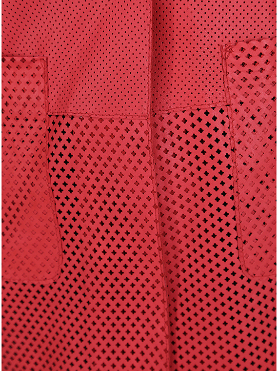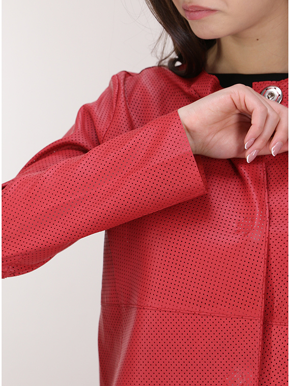 Bully jacket in perforated patchwork leather. Long sleeves and round neck. Patch pockets and front snap closures. Raw cut bottoms. The model is 1.70 tall and wears size 40.