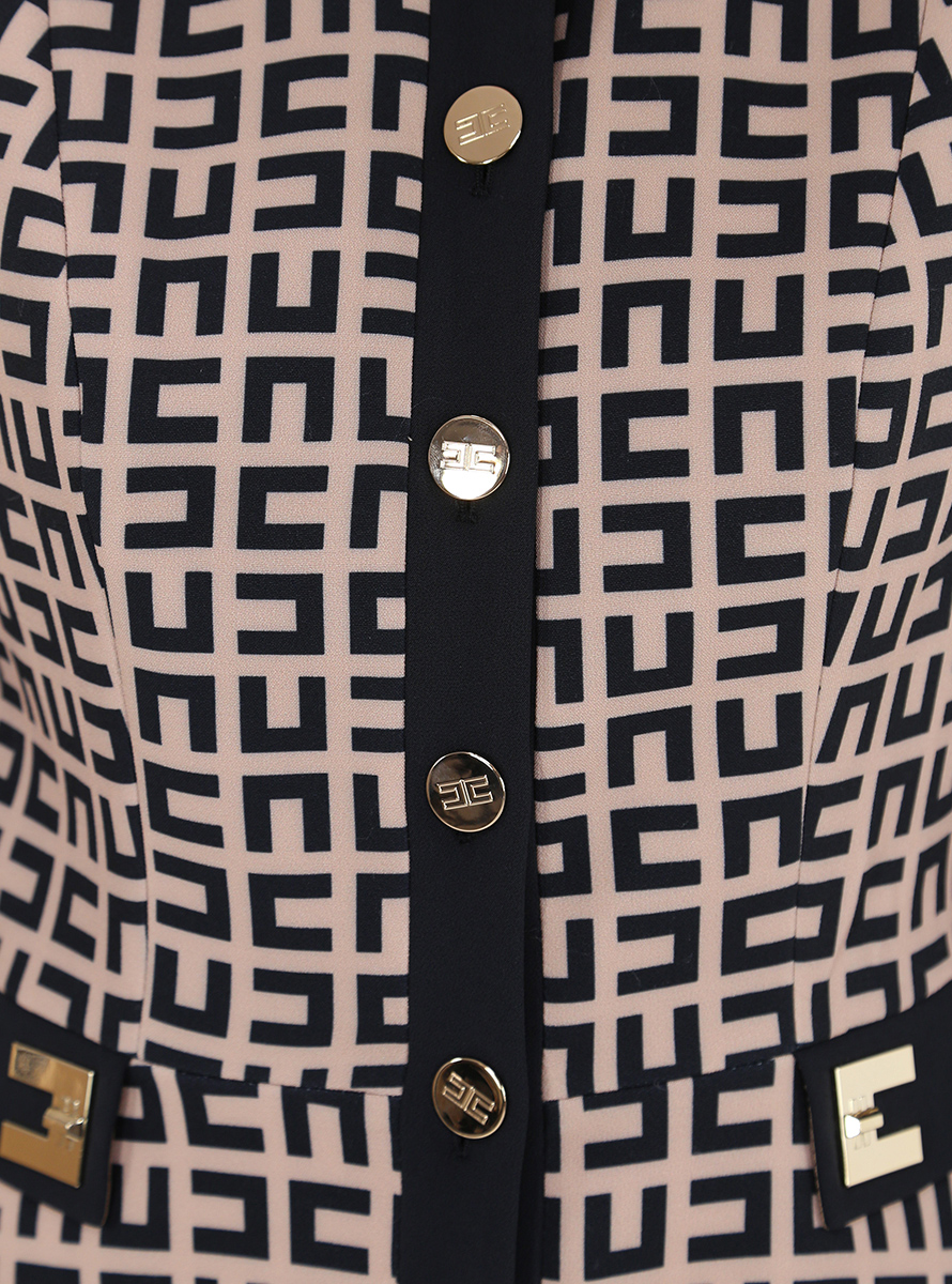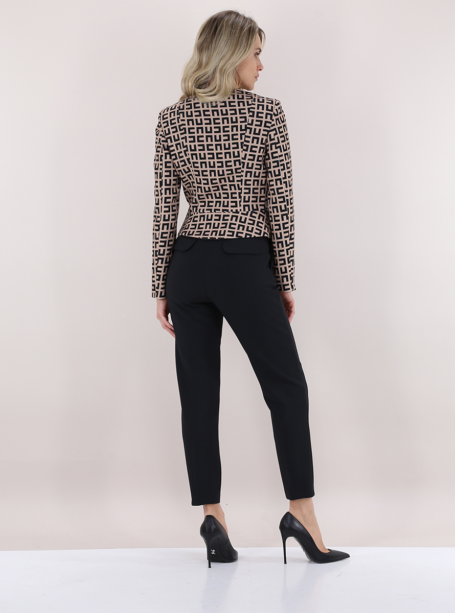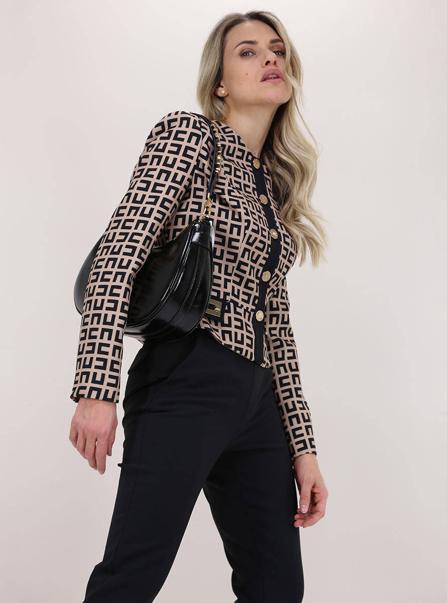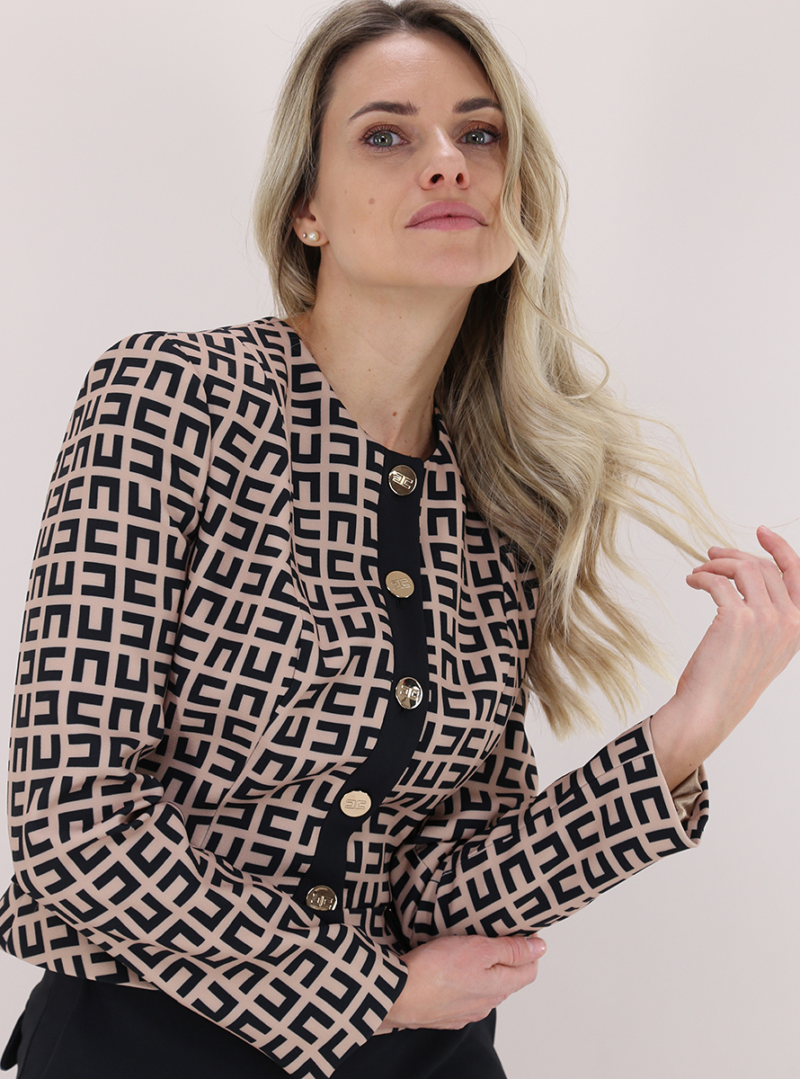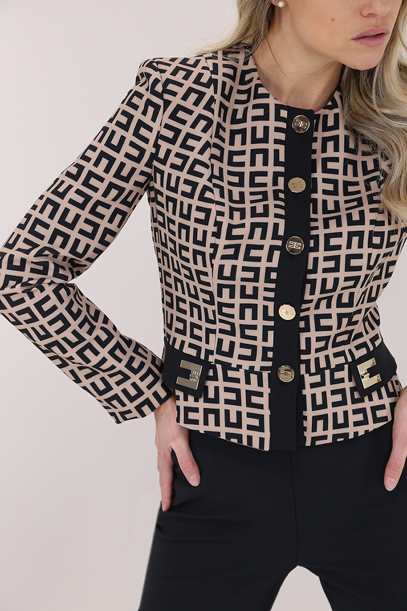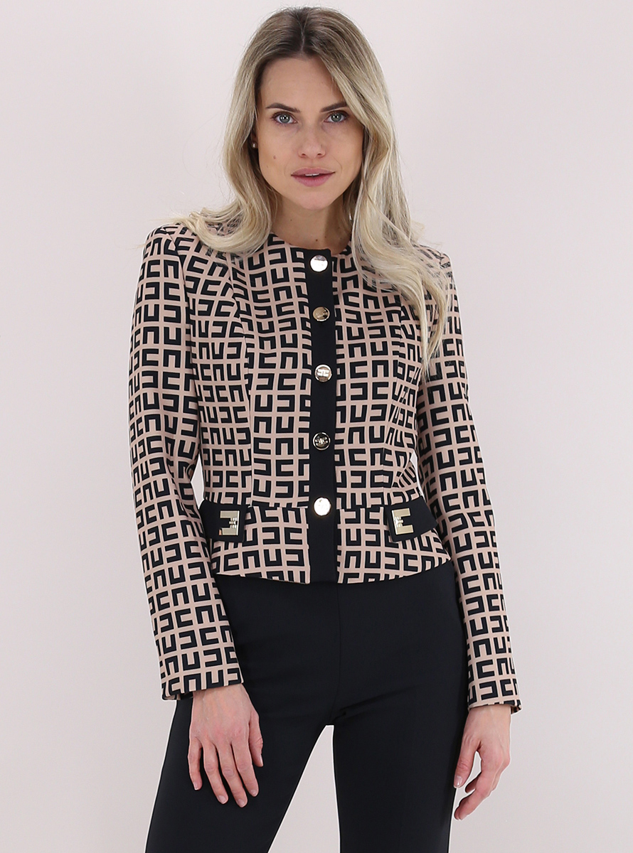 Elisabetta Franchi lined jacket with long sleeves and round neck. Ruffles at the waist with fake pockets with gold logo. Front closure buttons and Monogram pattern. The model is 1.68 tall and wears size 40.