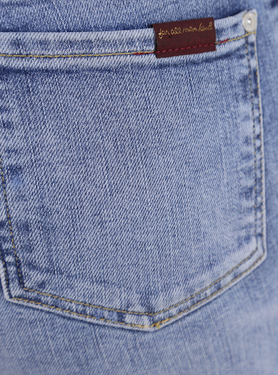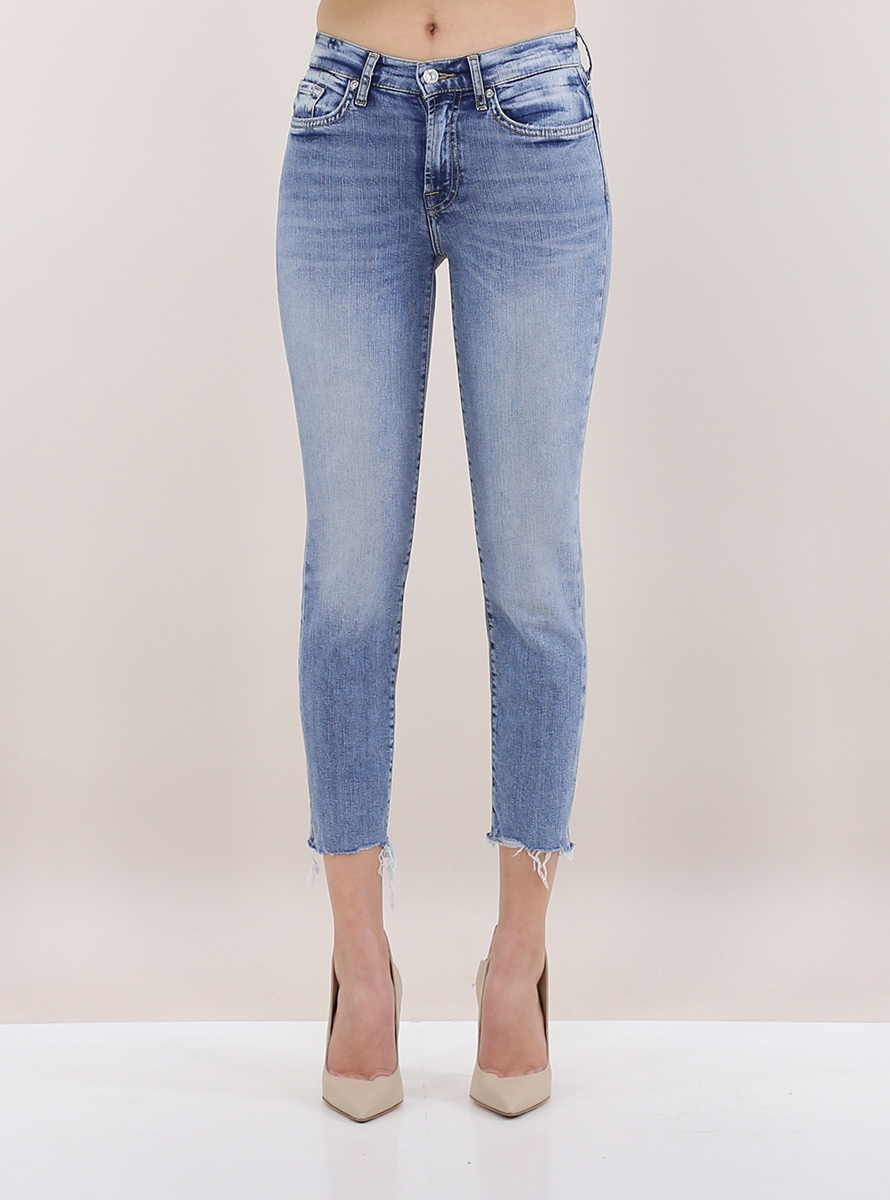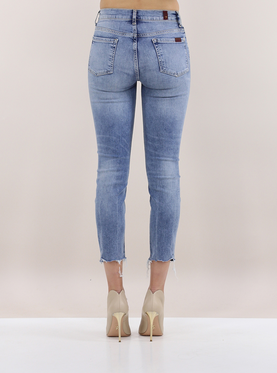 7 For All Mankind jeans in stretch cotton denim. Skinny fit and regular waist. Raw cut bottom. The model is 1.75 tall and wears size 25.