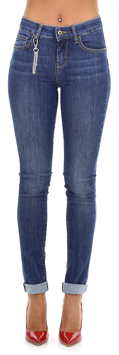 Jeans skinny a vita alta con risvolto sul fondo. Accessorio con strass incluso. La modella e' alta 1,68 e indossa la taglia 25.