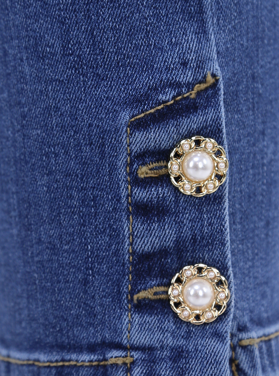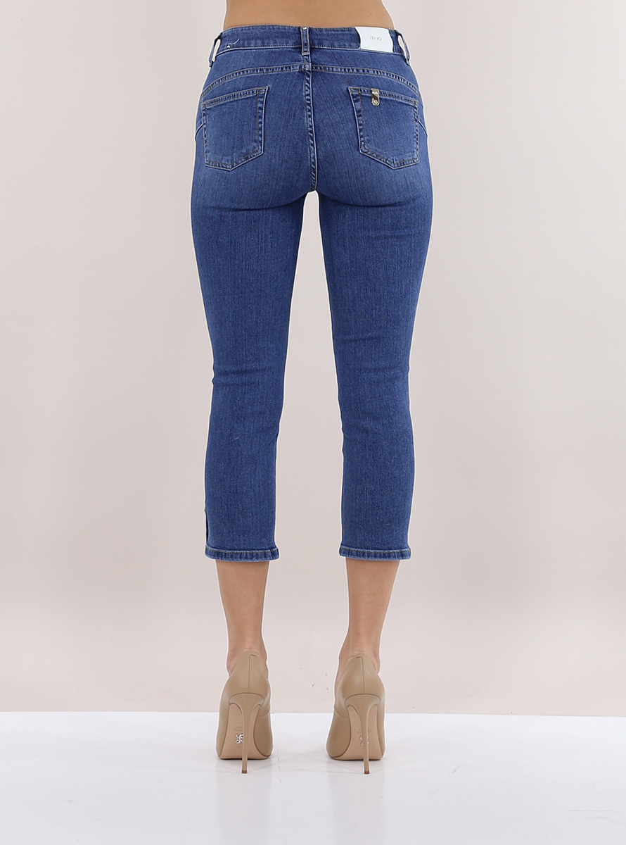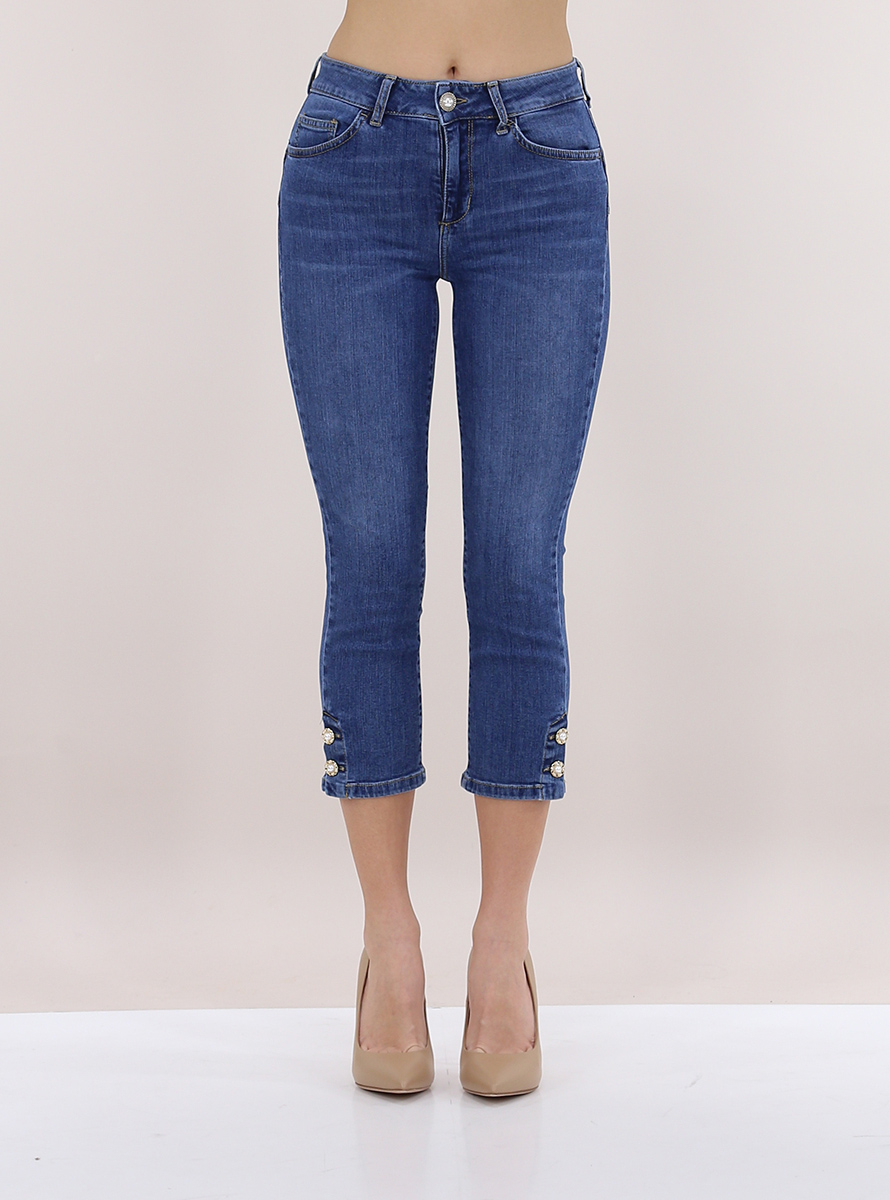 Liu.jo cropped bottom up jeans in stretch cotton denim. Regular waist and skinny fit. Jewel buttons on the bottom. The model is 1.75 tall and wears size 26.