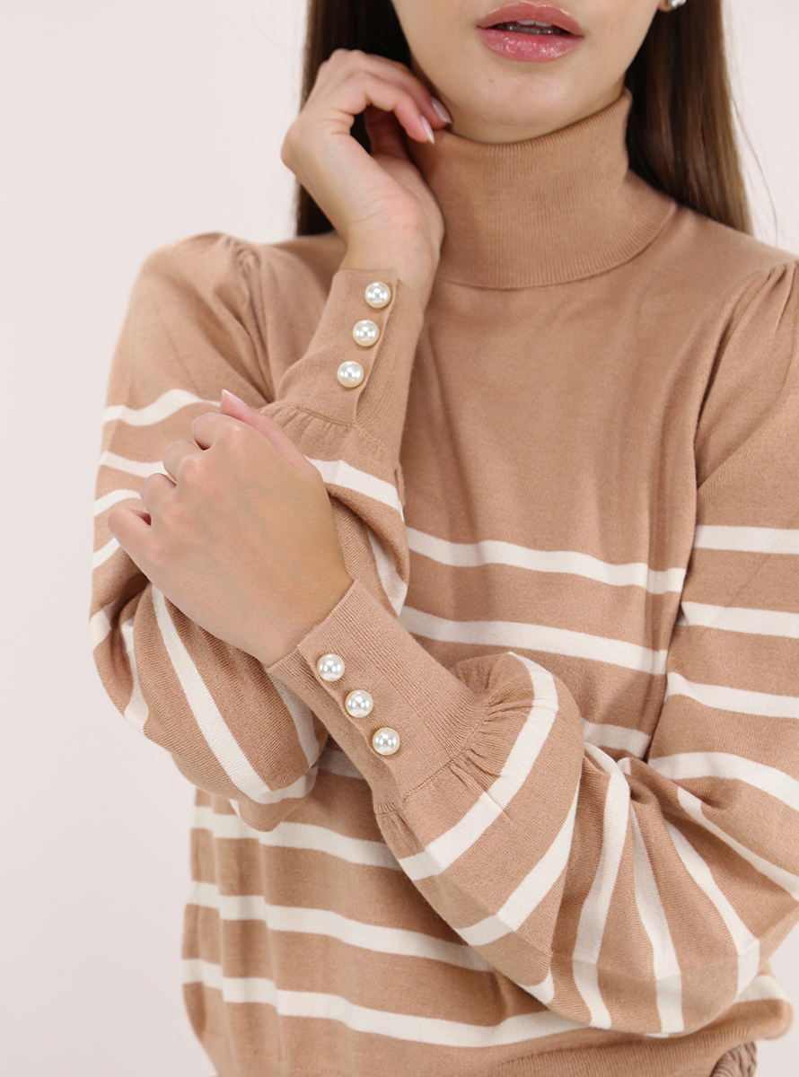 Liu.jo sweater in viscose blend with long puff sleeves with pearls on cuffs and turtleneck collar. Striped pattern. The model is 1.70 tall and wears size XS.