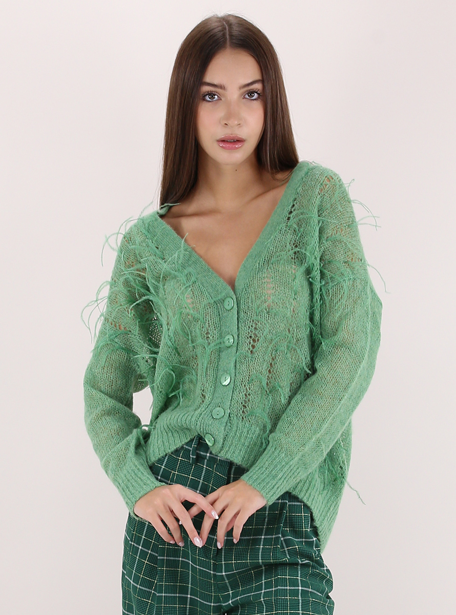 Liu.jo cardigan in wool and alpaca blend with long sleeves and V-neck. Frontal applied feathers. The model is 1.70 tall and wears size XS.
