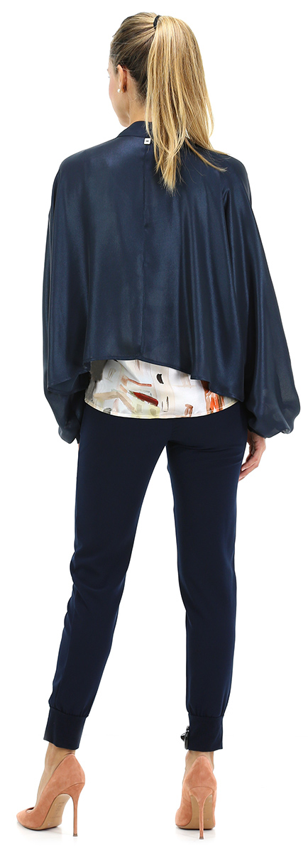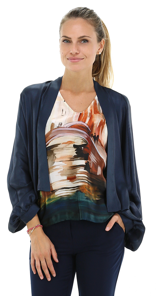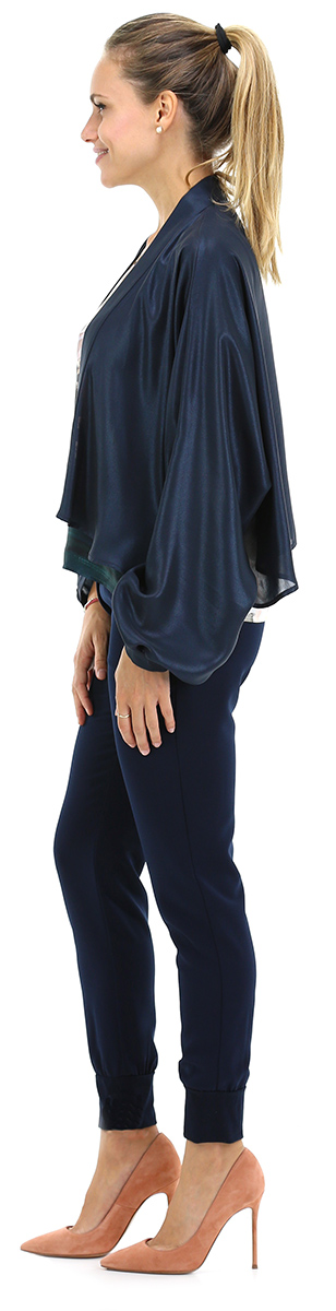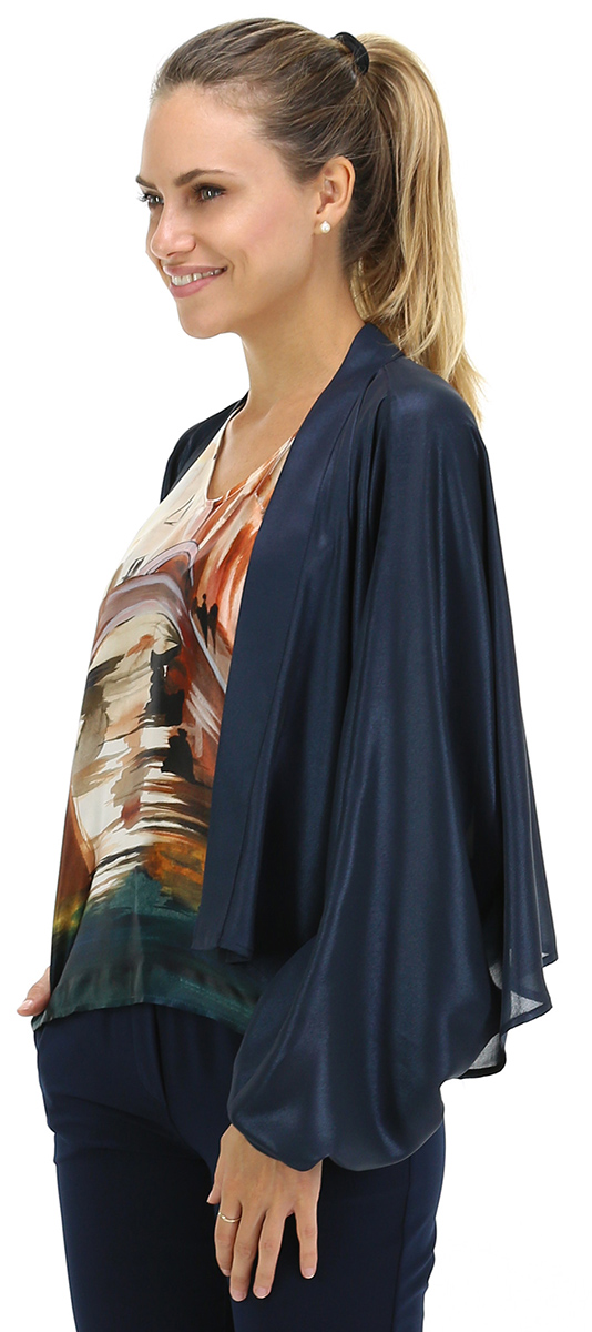 Kimono shrug, long sleeves with gathered cuffs and shawl neckline. The model is 1.68 tall and wears size 42.