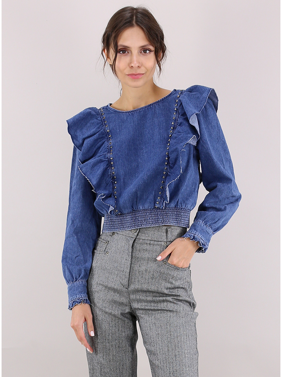 Twin Set Action cropped sweater in cotton denim. Long sleeves with cuffs and boat neck. Ruffles applied front and back with studs. Elastics on the bottom. The model is 1.80 tall and wears size XS.