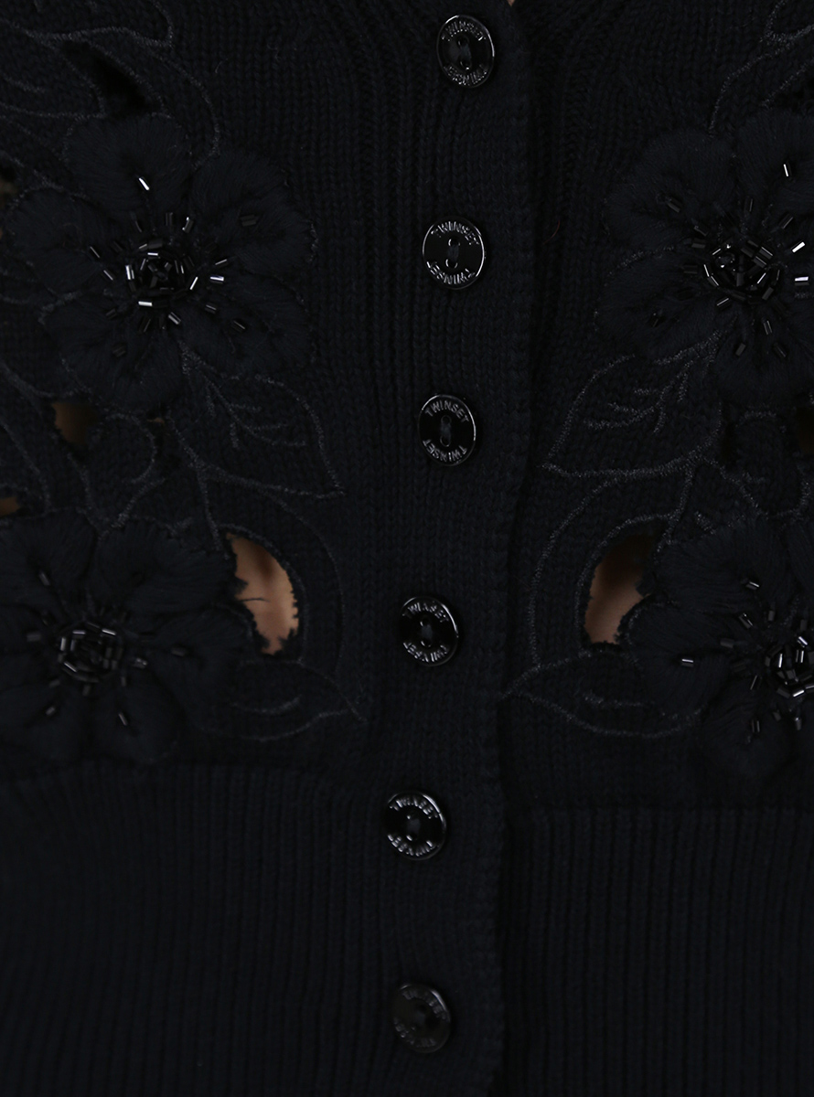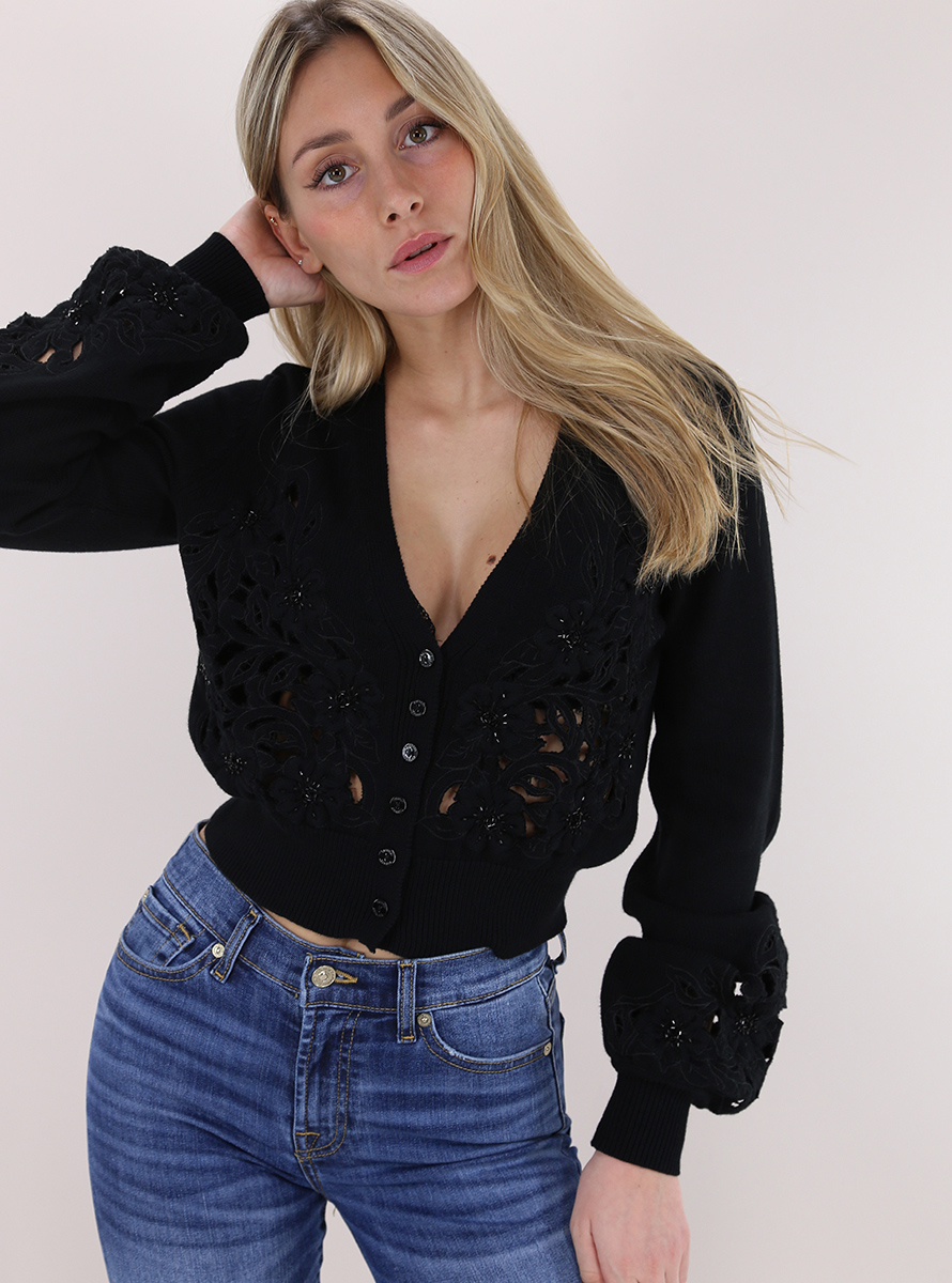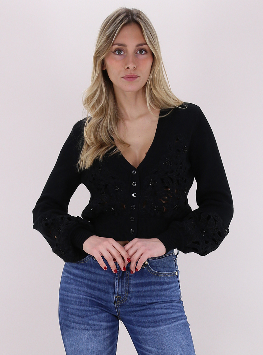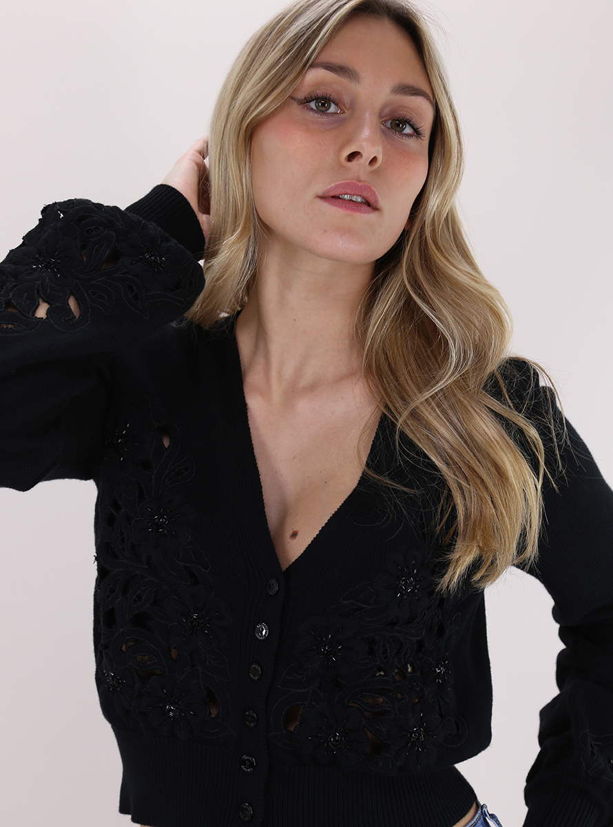 Twin Set cardigan in cotton blend. Wide long sleeves and V-neck. Front beaded cutwork embroidery. The model is 1.75 tall and wears size XS.