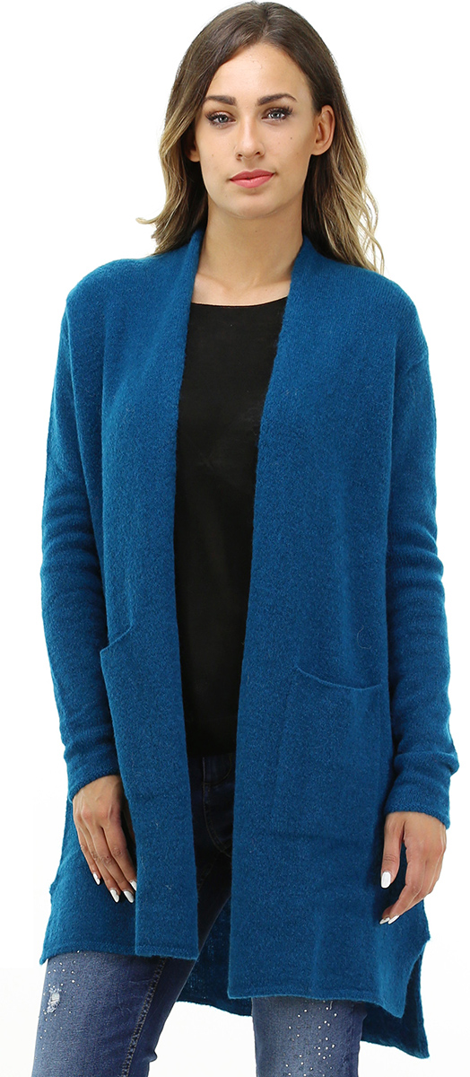 Cardigan in misto lana mohair a maniche lunghe con tasche frontali a sacchetto. La modella è alta 1.80 ed indossa la taglia M.