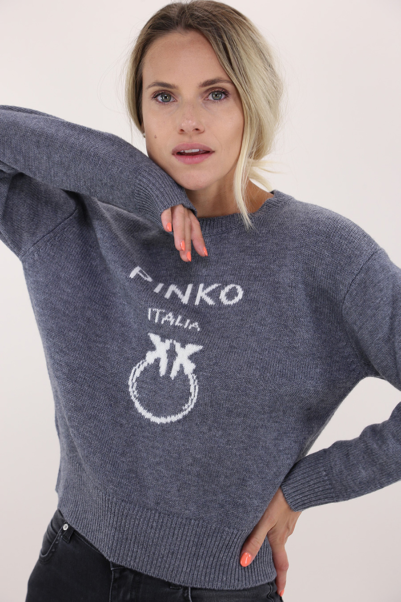 Pinko wool sweater with long sleeves and round neck. Front logo embroidery. The model is 1.68 tall and wears size XS.