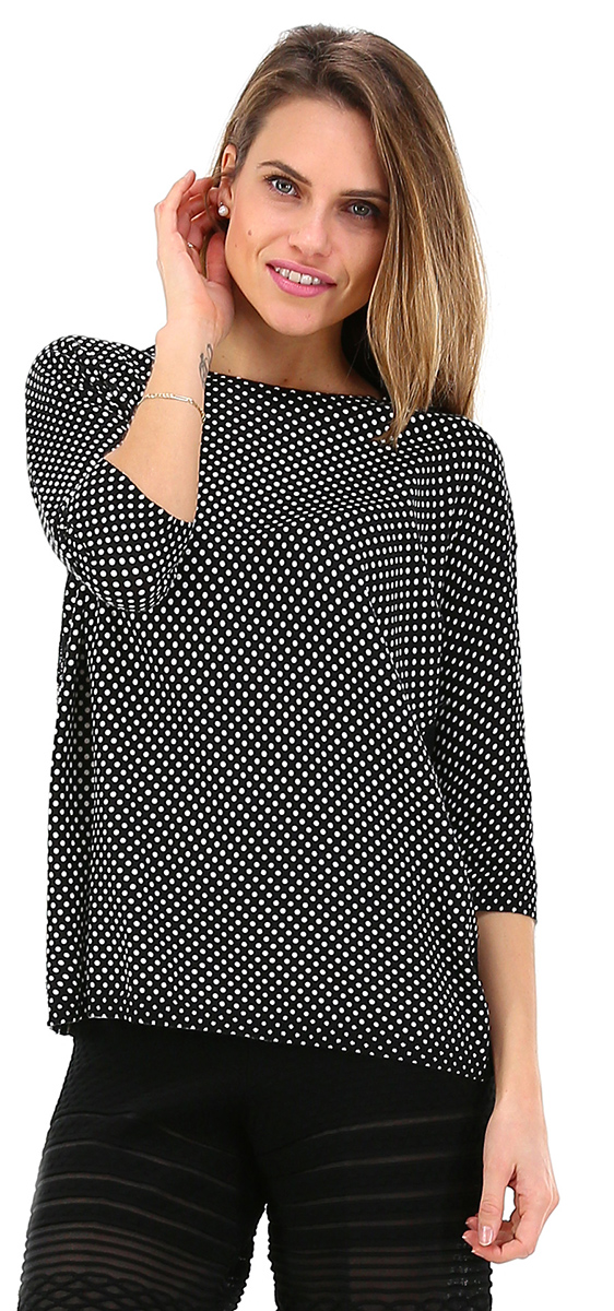 Maglia in cotone e viscosa con bande in pizzo laterali. Maniche a 3/4 e collo a giro.La modella è alta 1,60 e indossa la taglia XS.