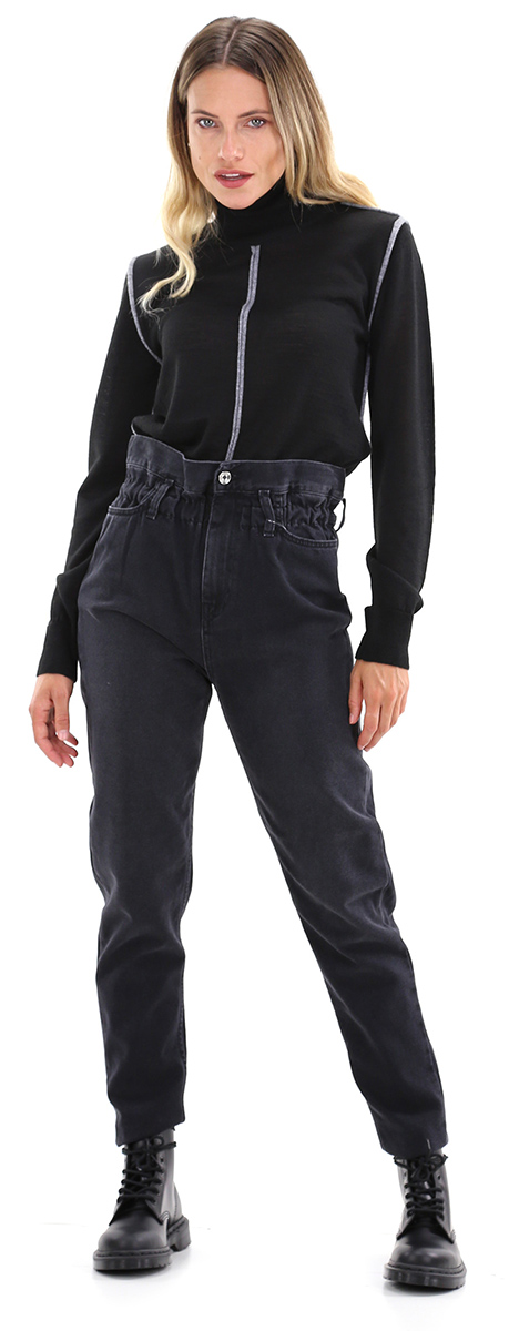 Jeans in cotone a caramella con fondi a taglio vivo. Vita alta ed elastico in vita. La modella è alta 1.68 ed indossa la taglia 25.