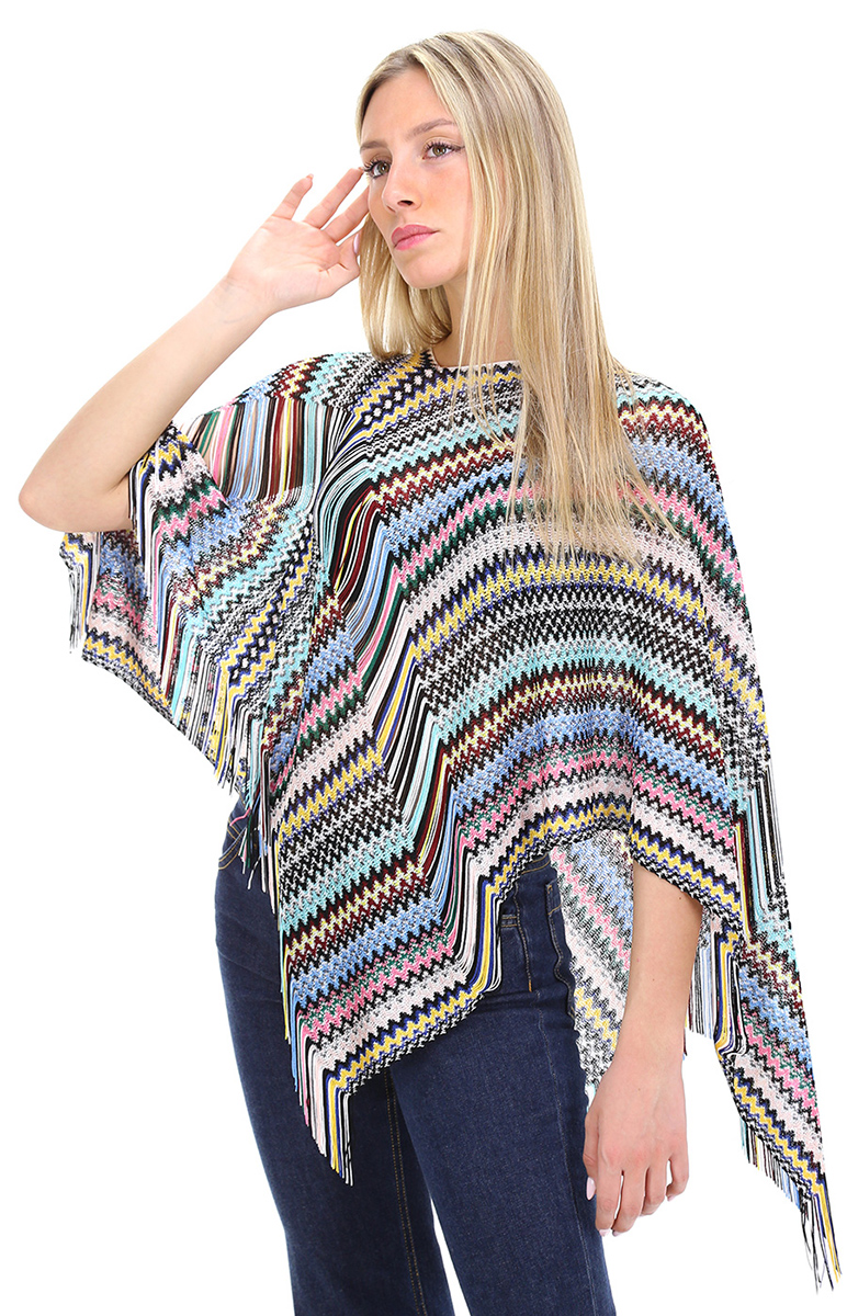 Poncho Missoni in viscosa con frange sul fondo. Fantasia a zig zag multicolor. La modella è alta 1,81 ed indossa la taglia UNICA.