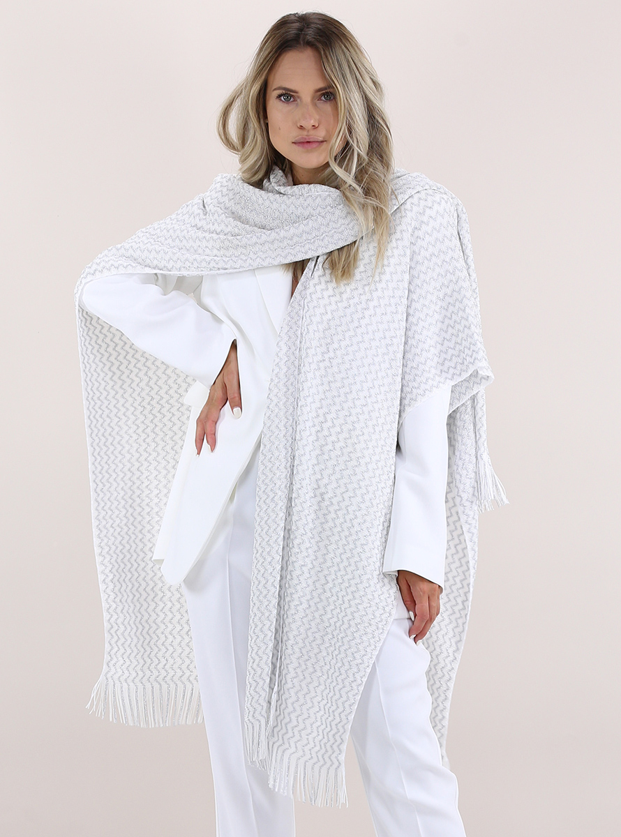 Missoni poncho in viscose and lurex blend. Fringe bottom and two-tone zig zag pattern. The model is 1.68 tall and wears the UNICA size.