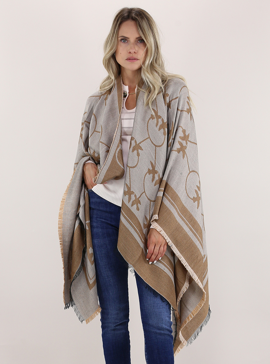 Poncho reversibile Pinko in misto lana e modal. Frange sul fondo. Fantasia jaquard logata. La modella è alta 1.68 ed indossa la taglia UNICA.