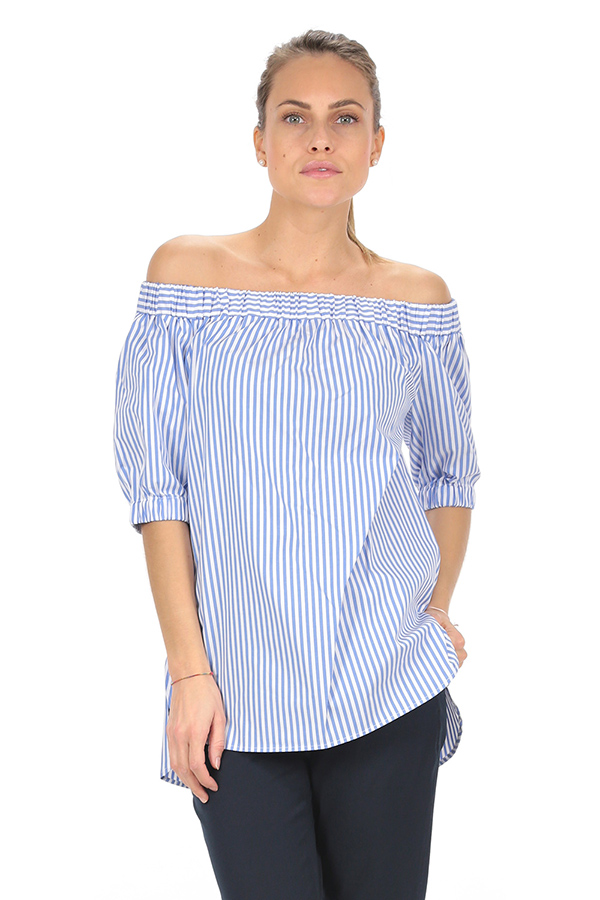 Camicia in cotone con elastico sullo scollo e sul fondo manica. Taglio asimmetrico e fantasia a righe.