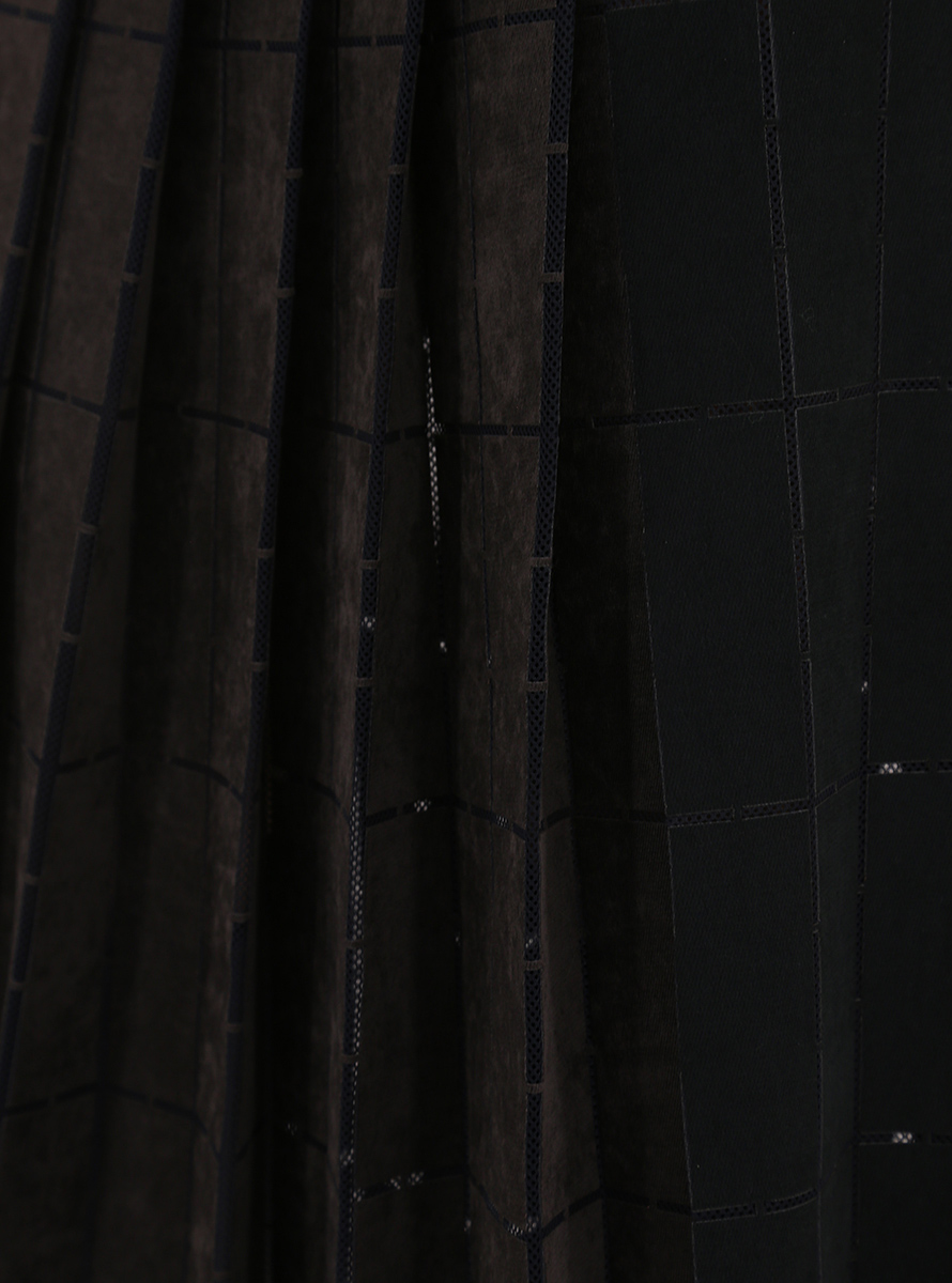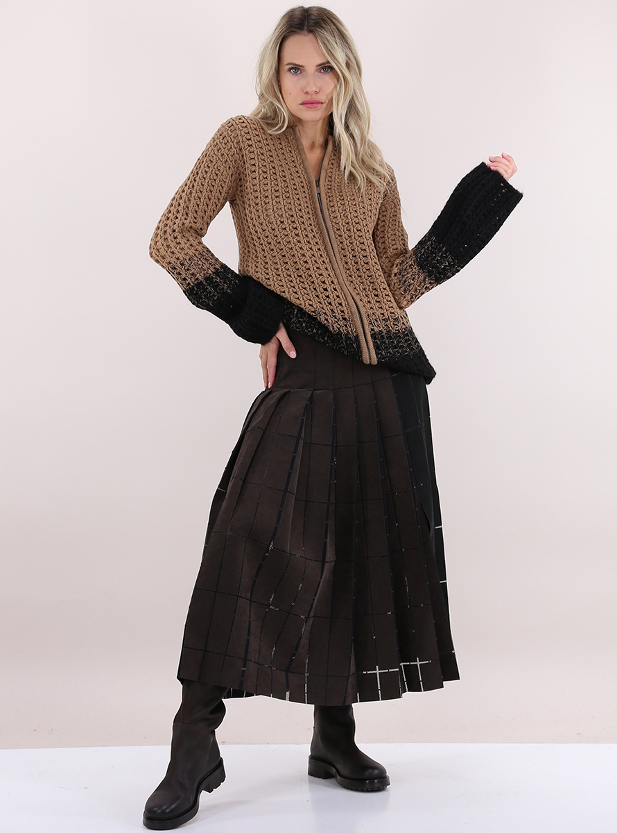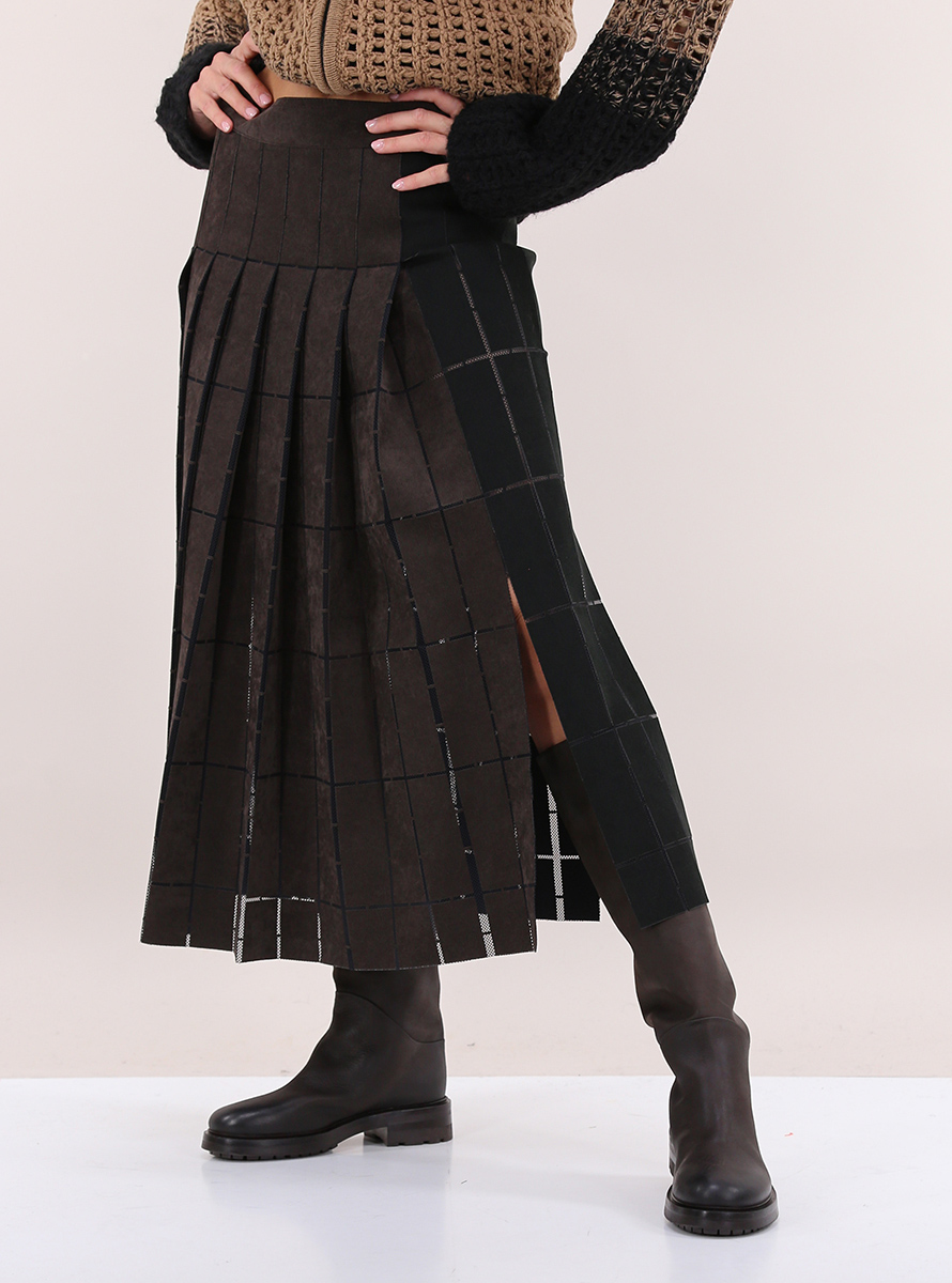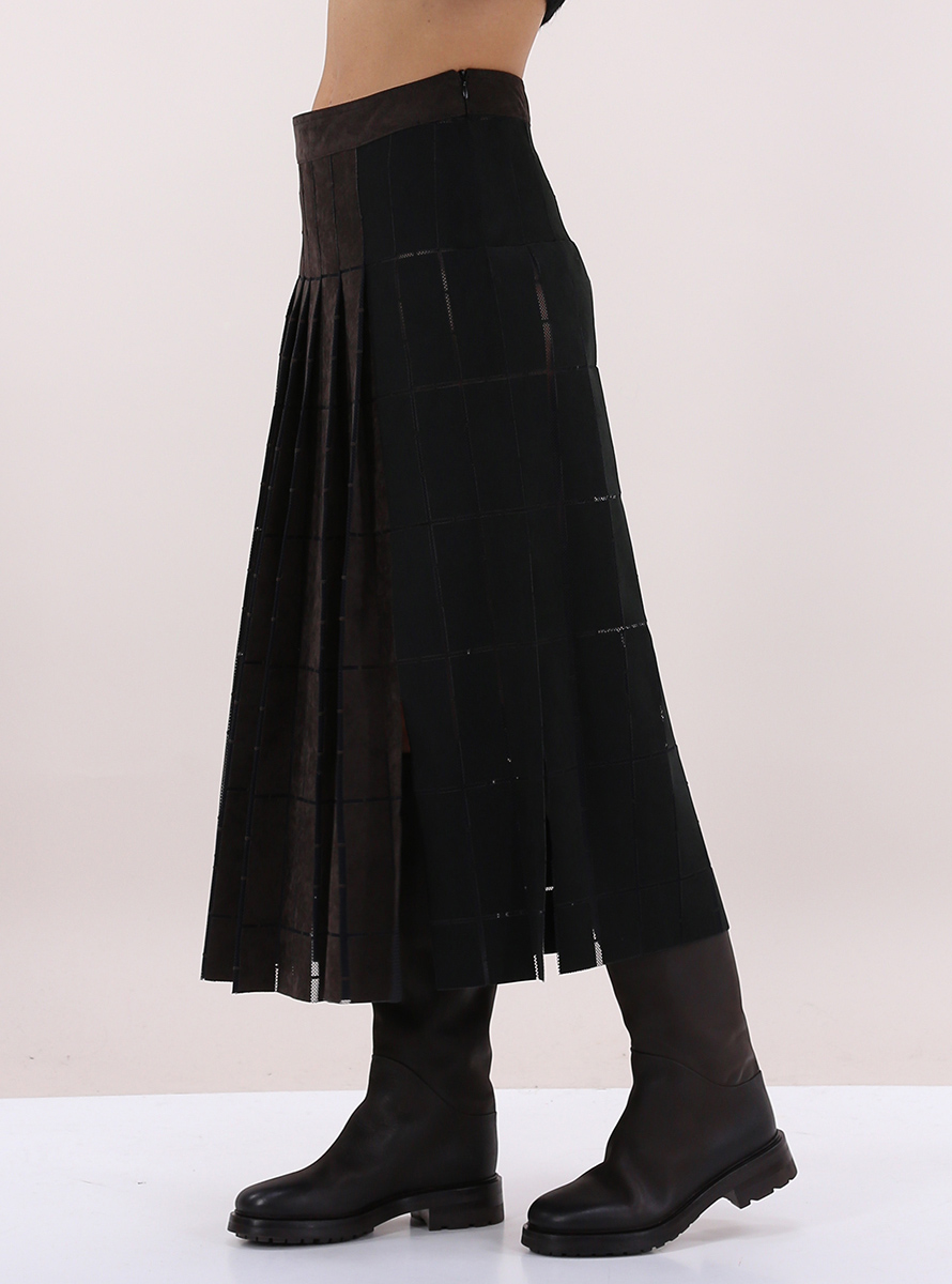 Aviu' patch skirt with high waist and pleats with transparent inserts. Side and back slits and raw cut bottom. Side zip closure. The model is 1.67 tall and wears size 40.