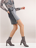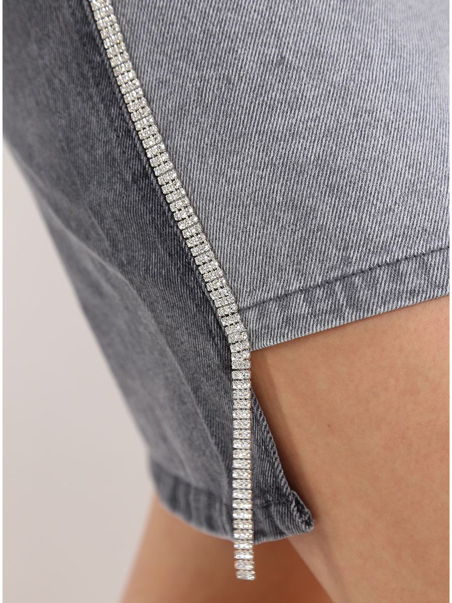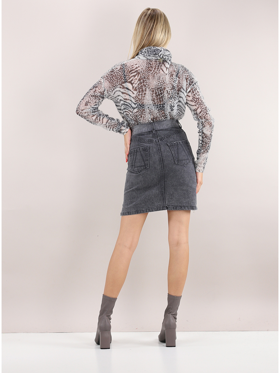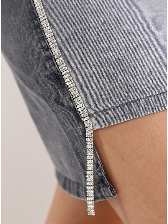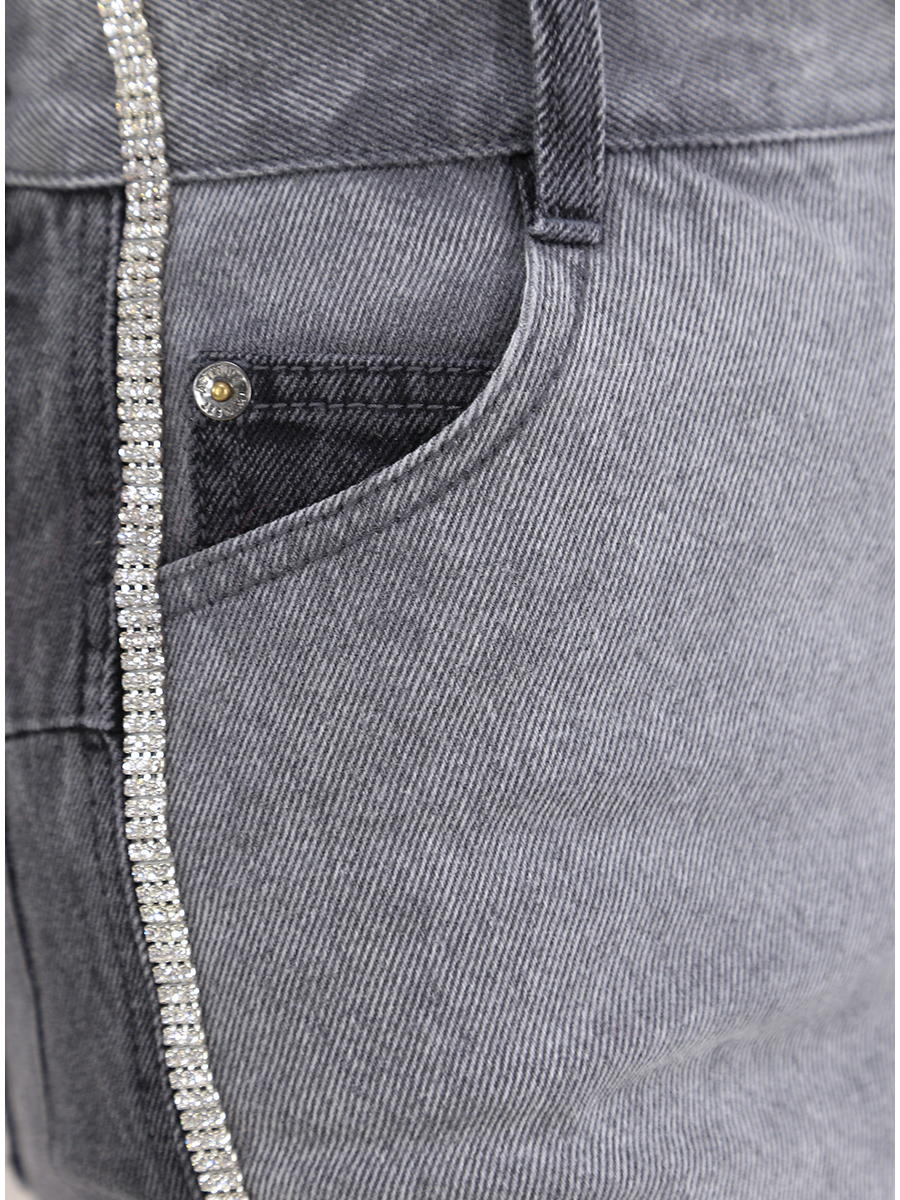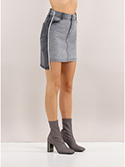 Twin Set Action asymmetric skirt in washed cotton denim. Side bands in rhinestones and two-tone effect on the front and back. The model is 1.70 tall and wears size XS.