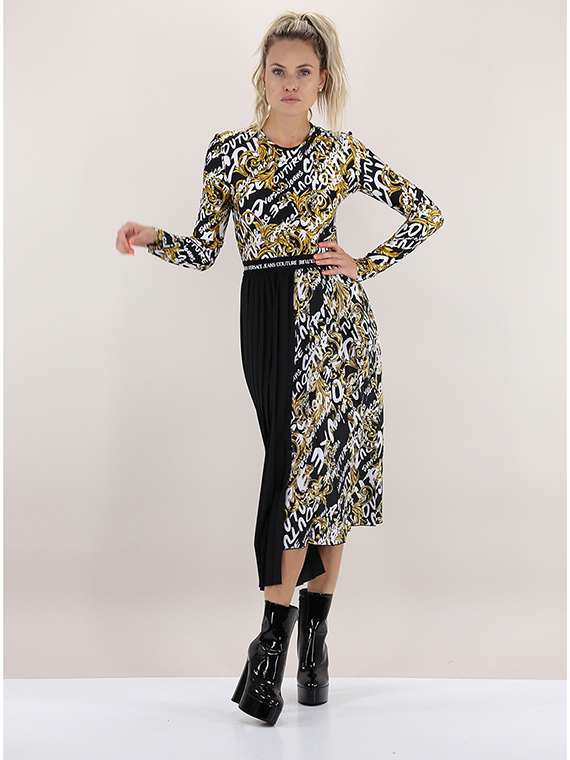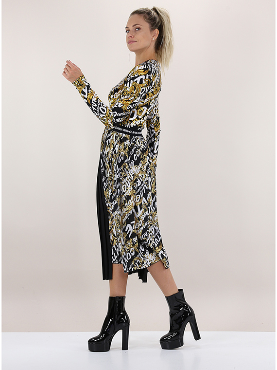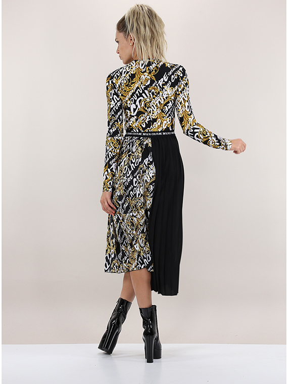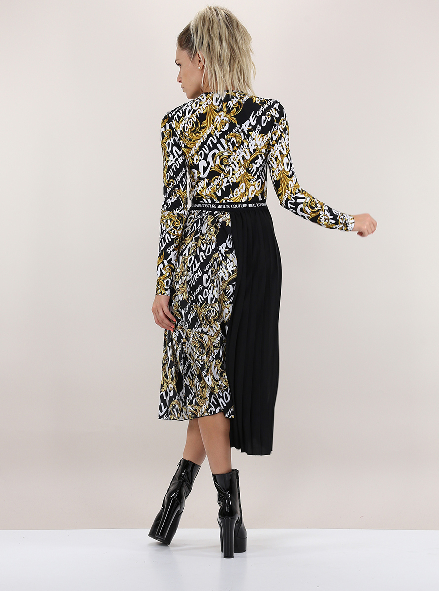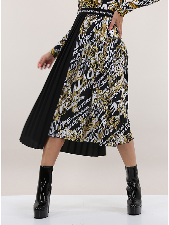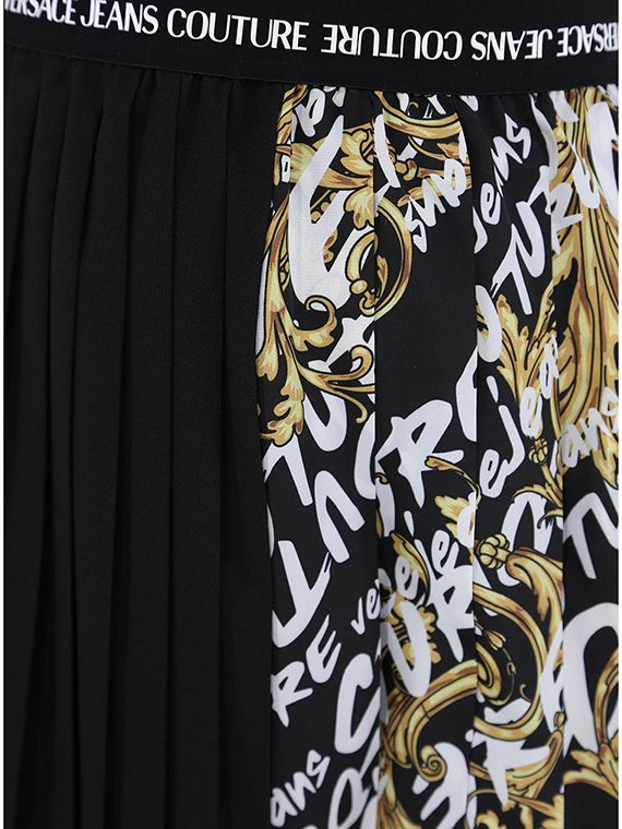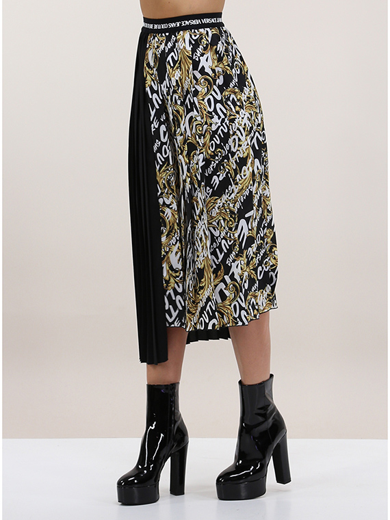 Versace Jeans Couture patchwork pleated skirt. Logoed elastic waistband and asymmetric hem. Logoed damask pattern. The model is 1.68 tall and wears size 40.