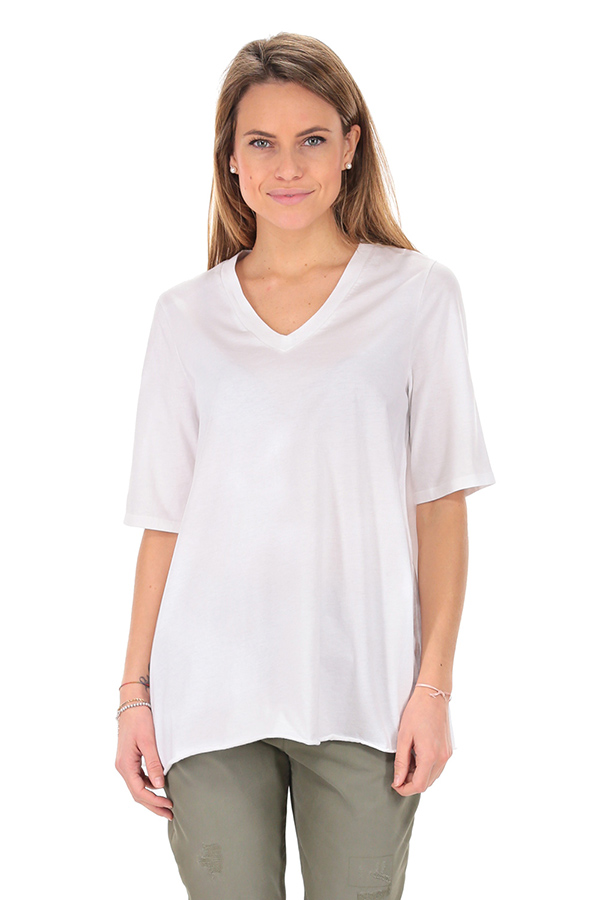 Maglia di cotone svasata, scollo a V e maniche corte. La modella è alta 1.68 ed indossa la taglia S.