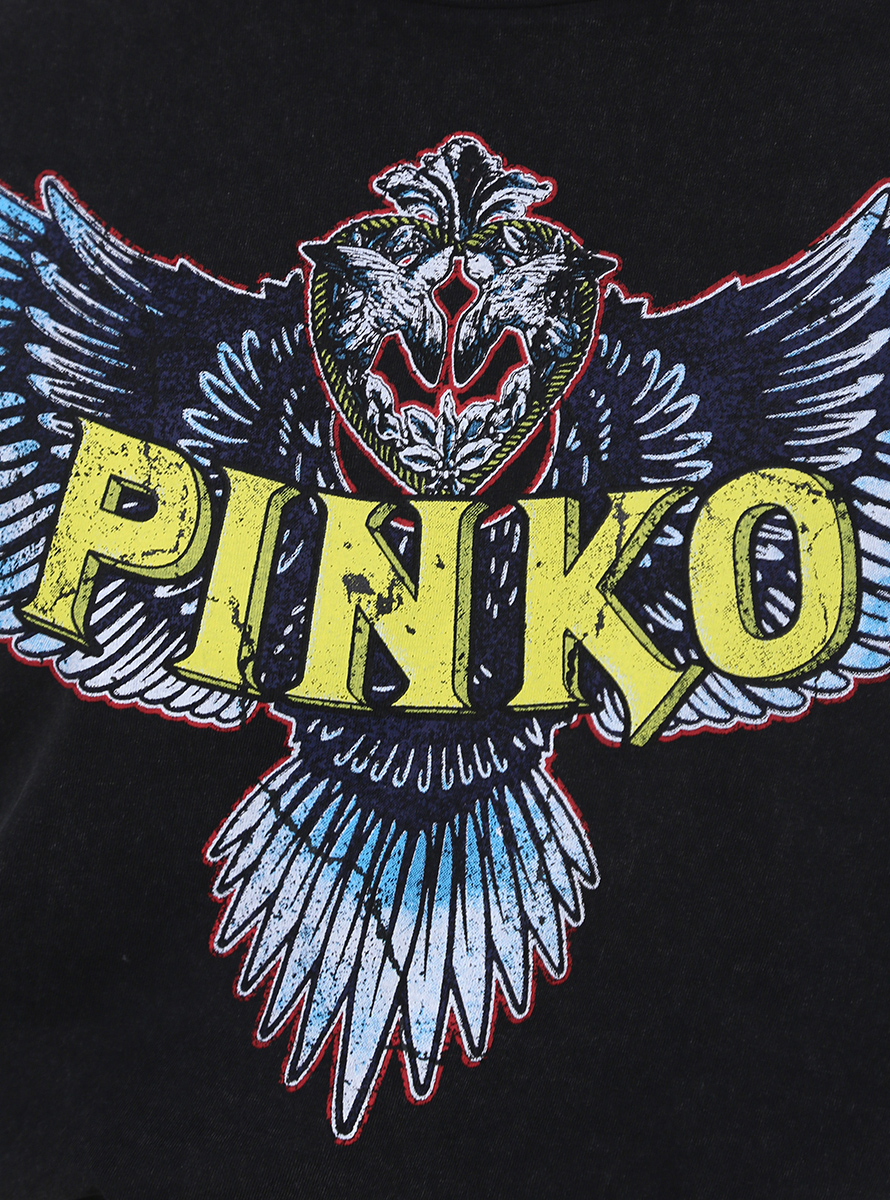 Pinko short-sleeved cotton T-shirt with contrasting metal mesh. Round neck and multicolor front logo print. The model is 1.68 tall and wears size XS.