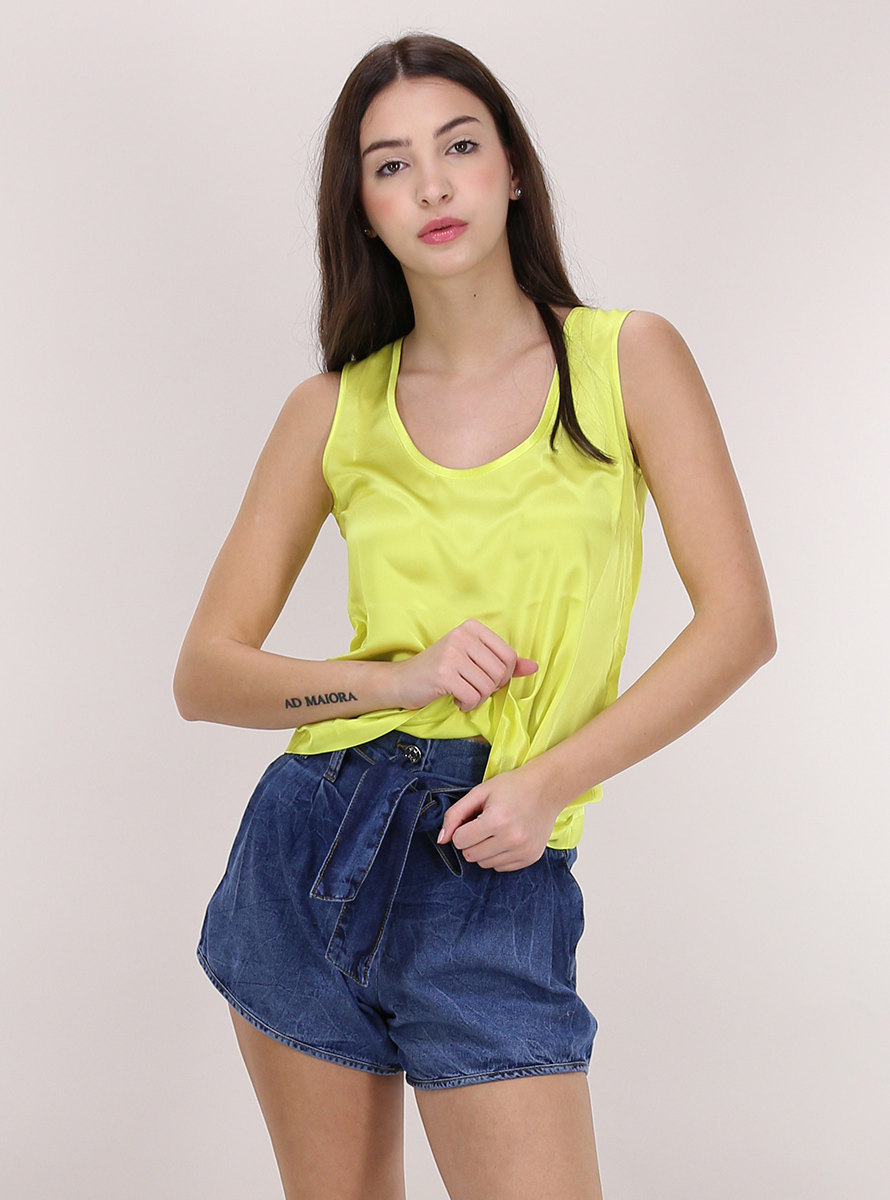 Top ampio Liu.Jo in raso di seta con collo a giro ampio. La modella è alta 1.70 ed indossa la taglia 38.