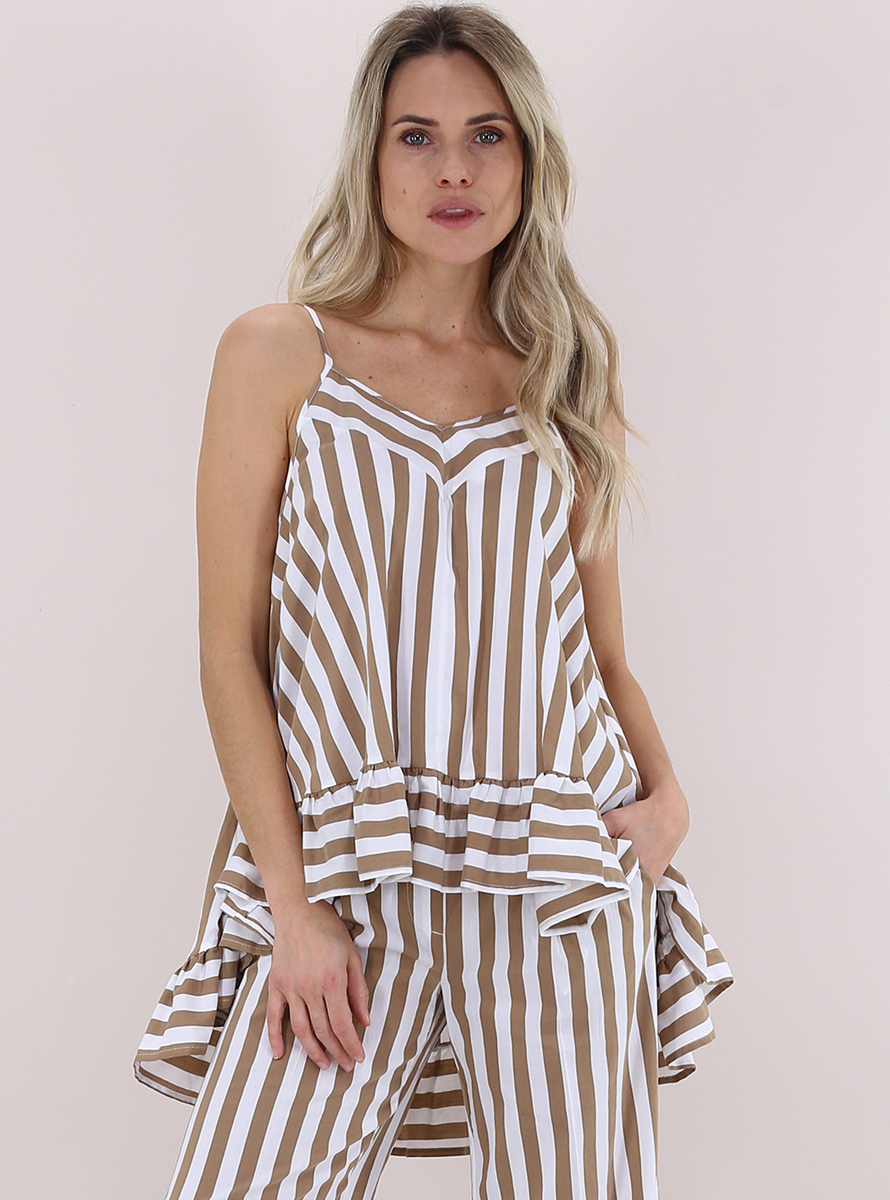 Semi-couture top in stretch cotton. Front V-neck. Asymmetrical flare on the bottom with gathered frill. Two-tone striped pattern. The model is 1.68 tall and wears size 38.