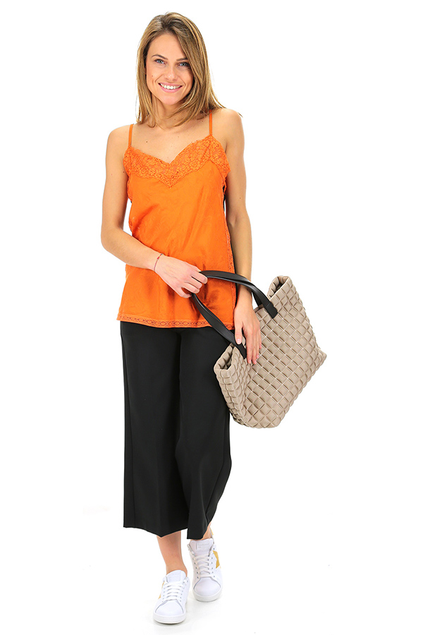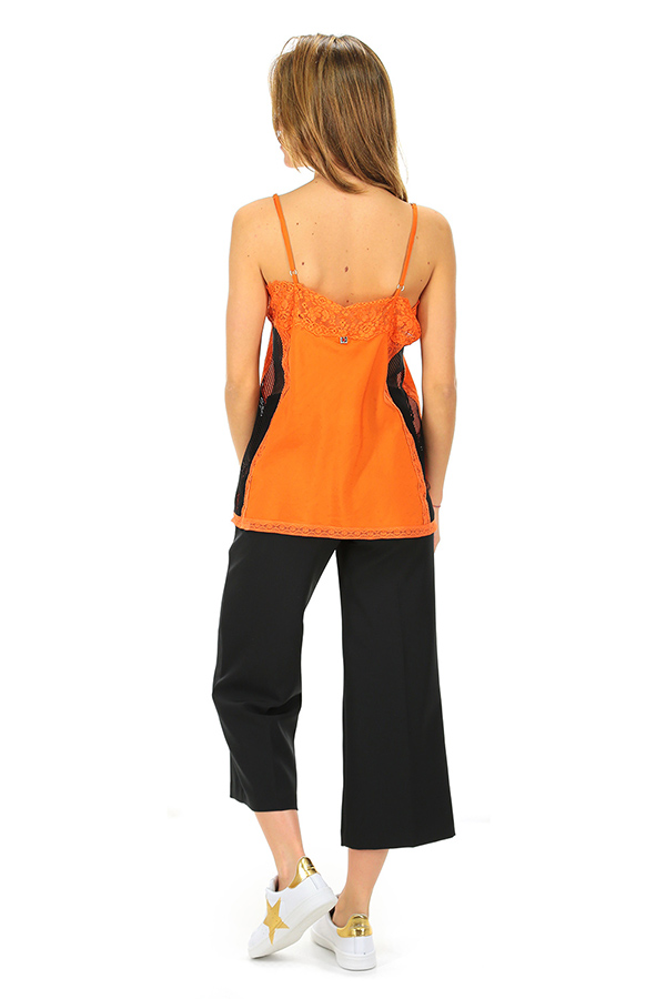 Viscose top with side inserts in contrasting mesh and lace. Adjustable shoulder straps. Our model wears size /EU XS.