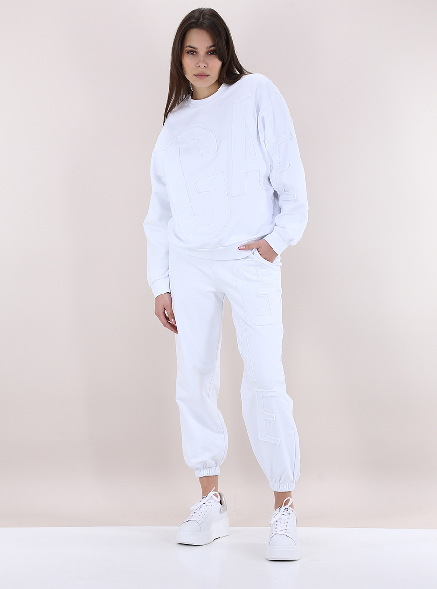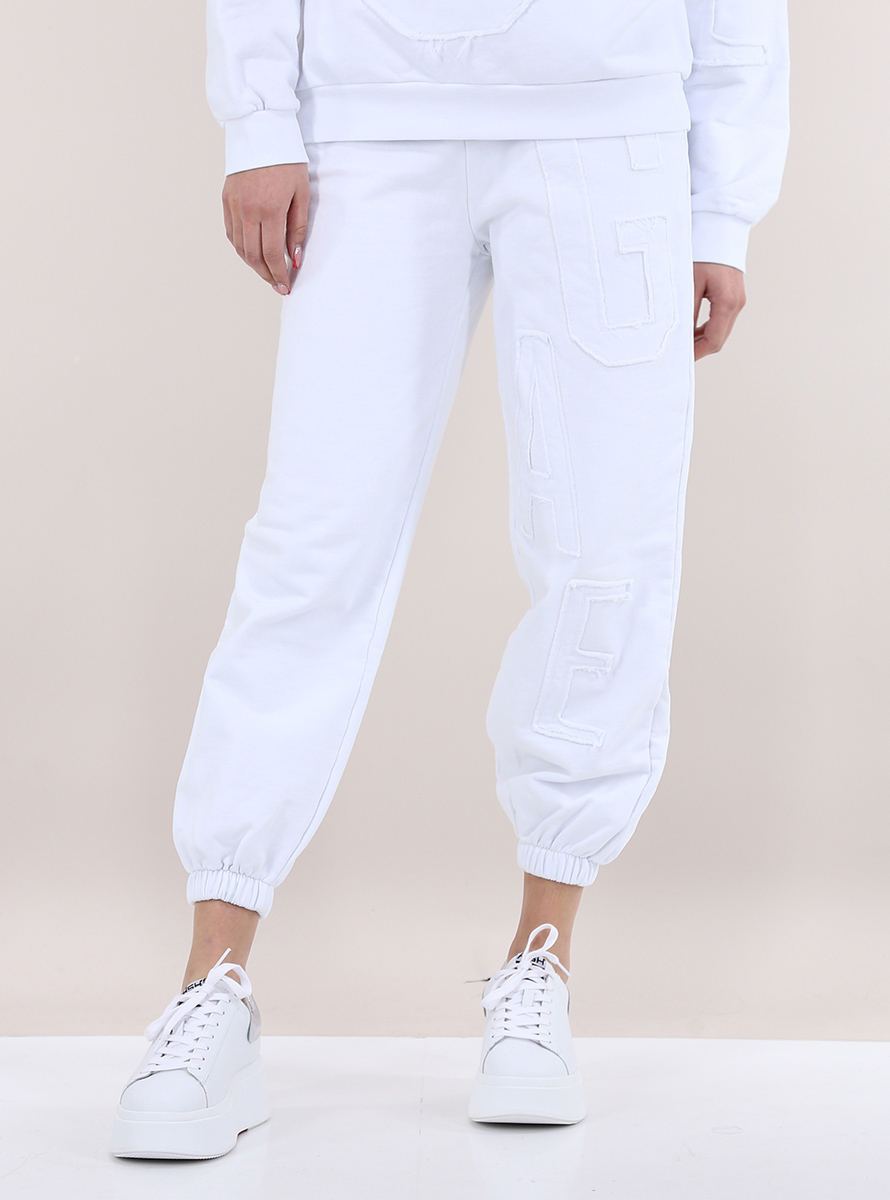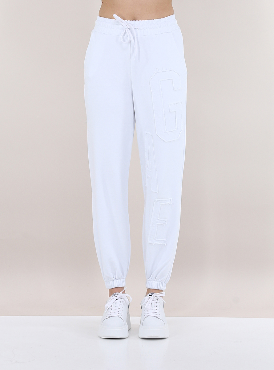Gaelle Paris jogger pants in cotton fleece. Elastic and drawstring waist. Slash pockets and front and back fabric logo appliqué. The model is 1.75 tall and wears size 38.