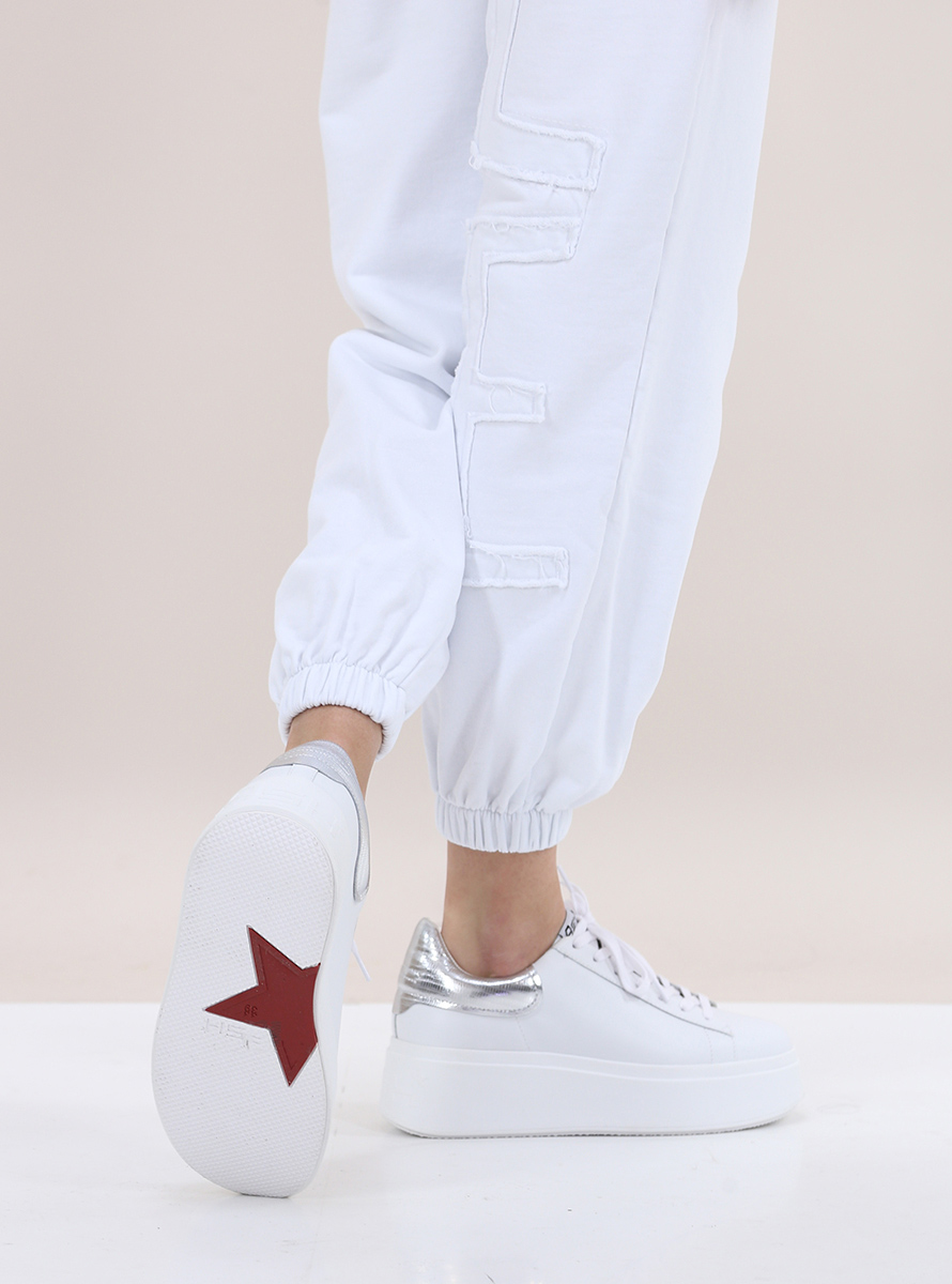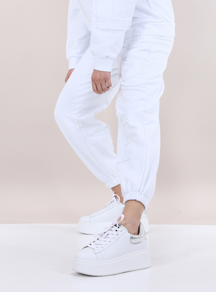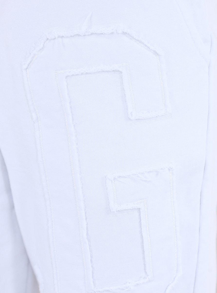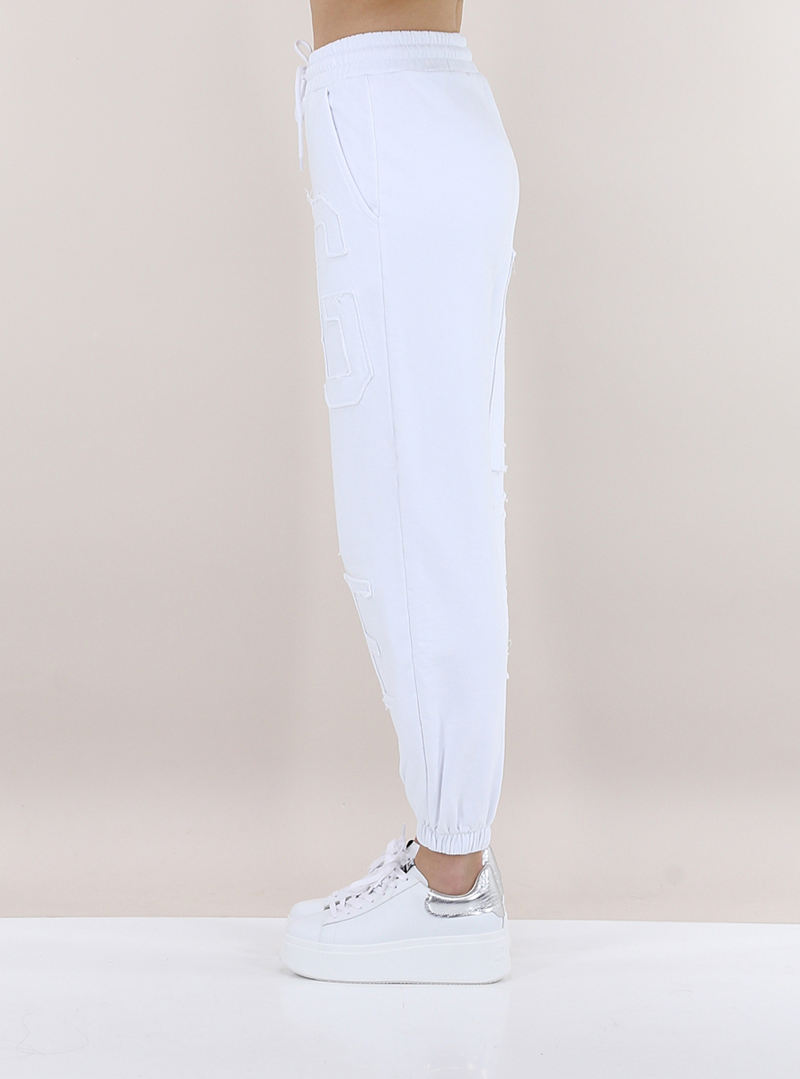 Gaelle Paris jogger pants in cotton fleece. Elastic and drawstring waist. Slash pockets and front and back fabric logo appliqué. The model is 1.75 tall and wears size 38.