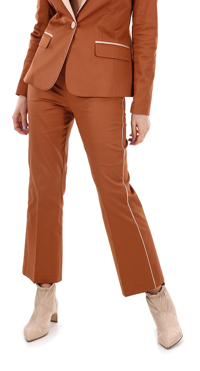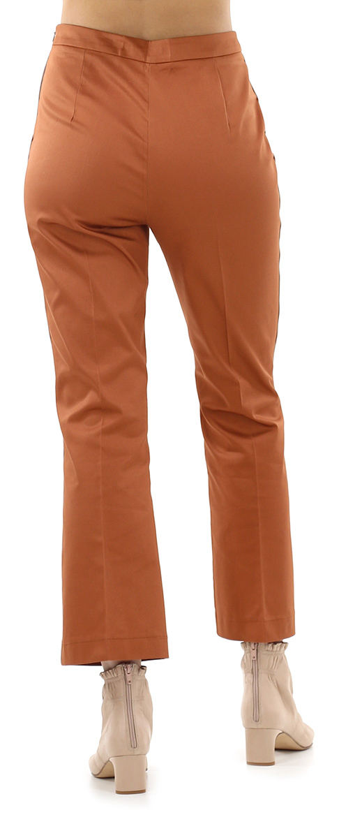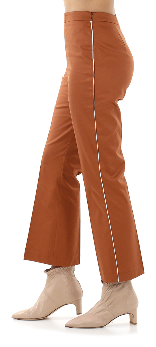 High-waisted trumpet trousers in cotton and elastane. Contrasting side profile with zip closure. The model is 1.68 cm tall and wears size 38.