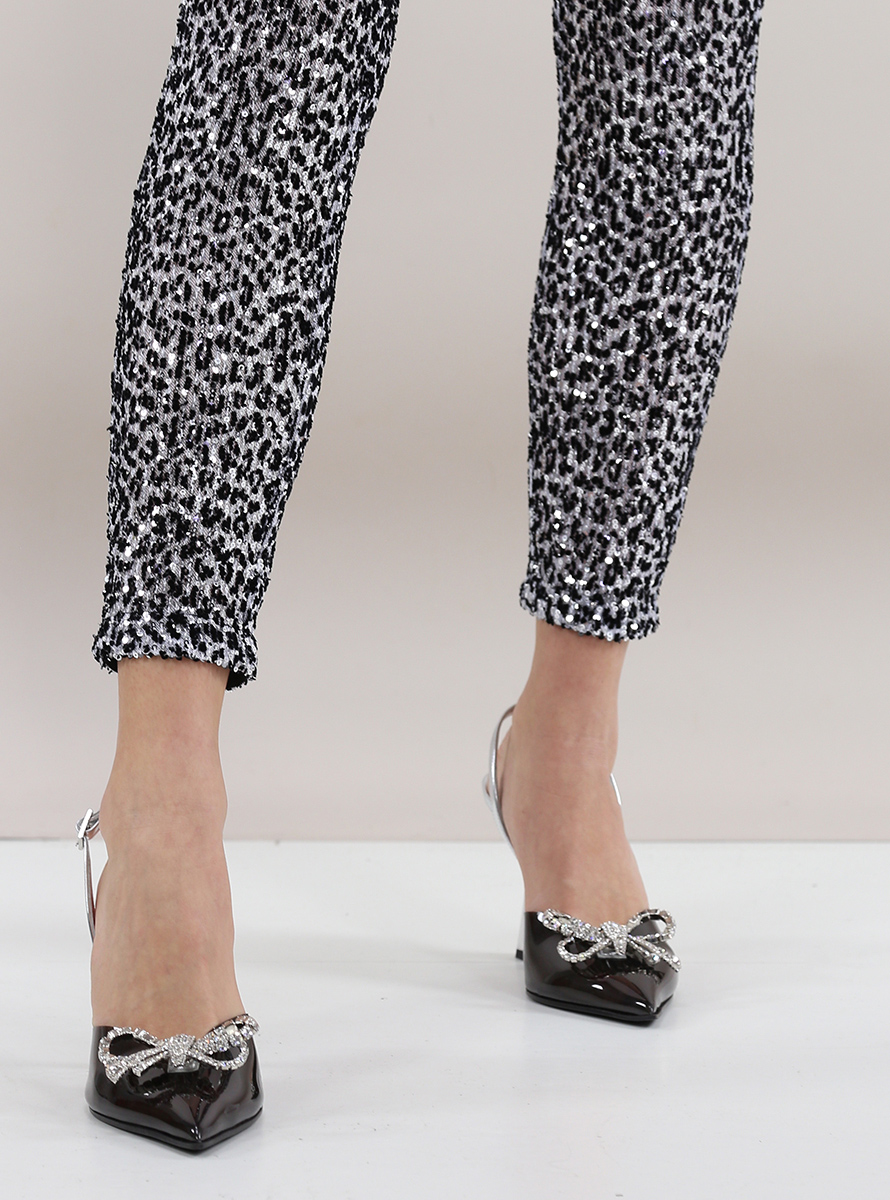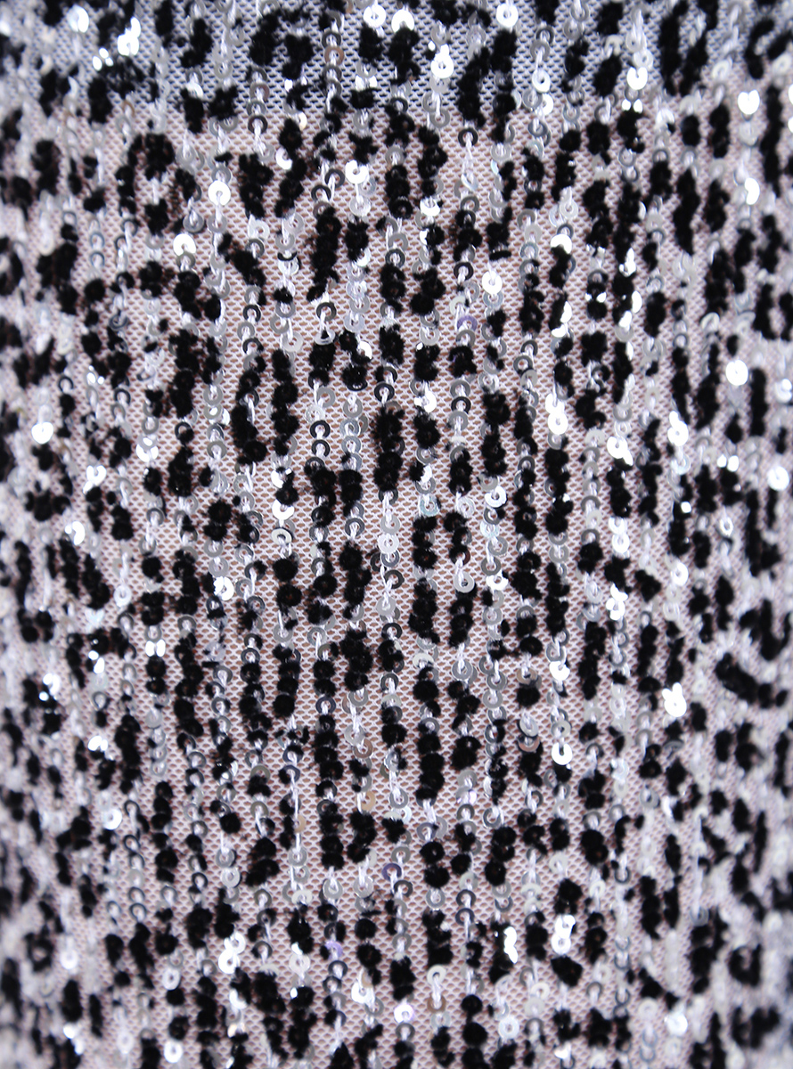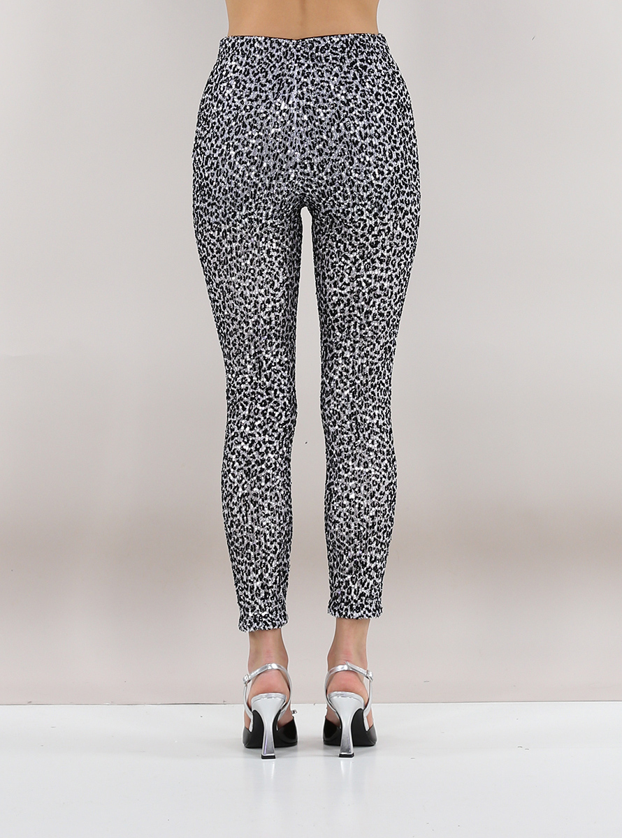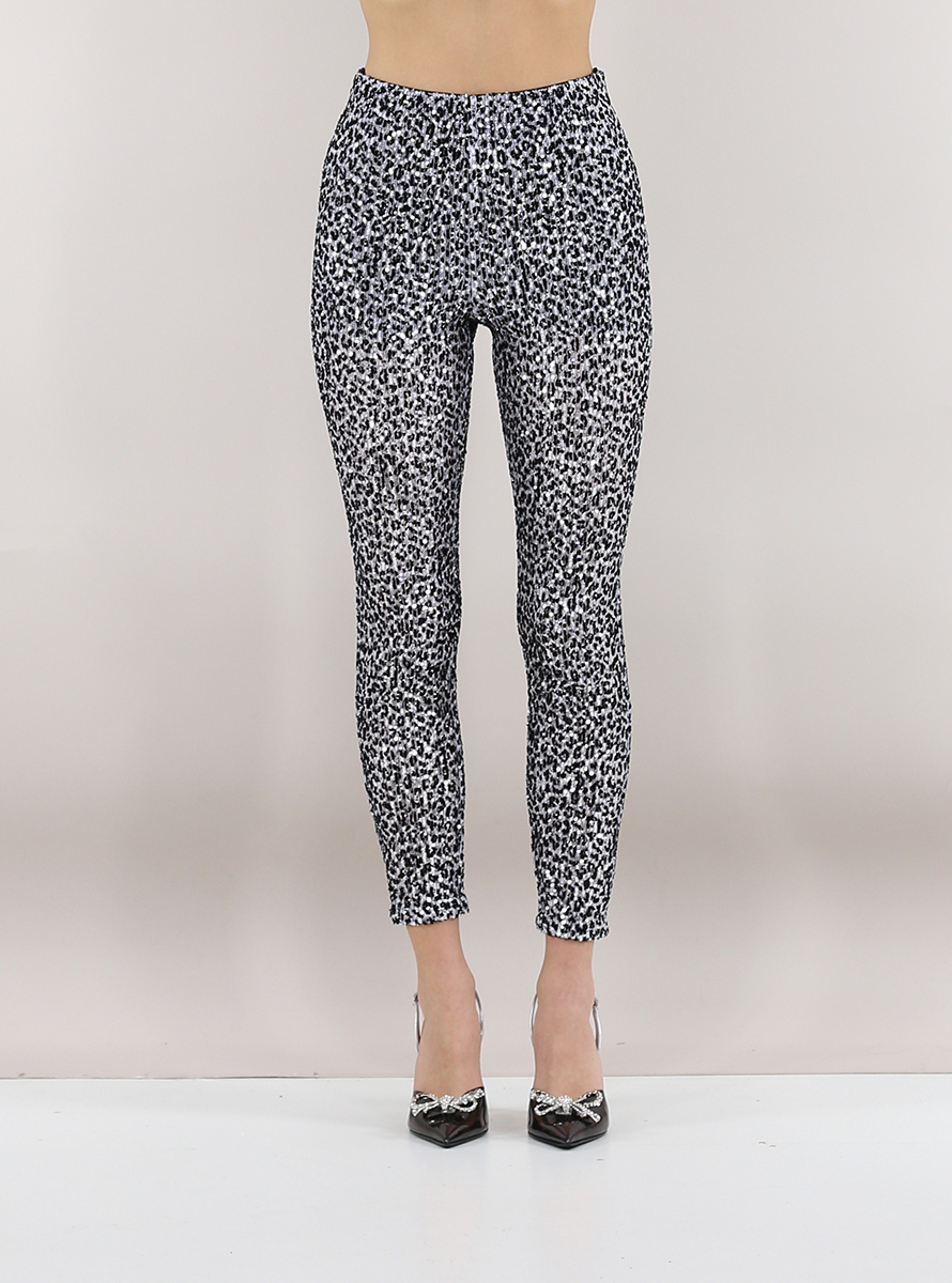 Simona Corsellini Limited Edition sequined trousers with coulotte lining. Elastic waist and bottom. Velvet animalier pattern. The model is 1.70 tall and wears size 40.