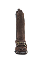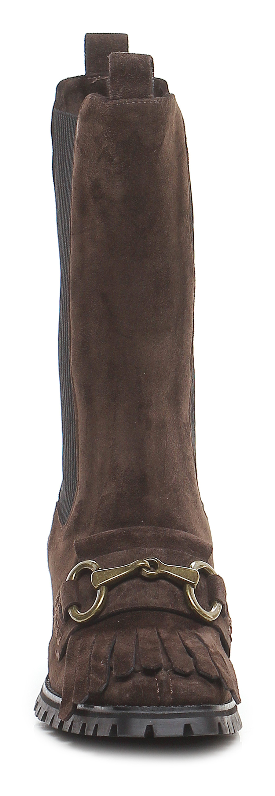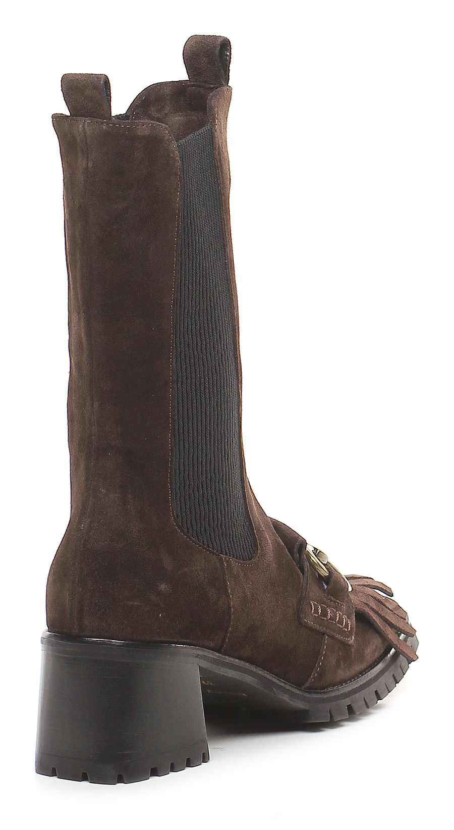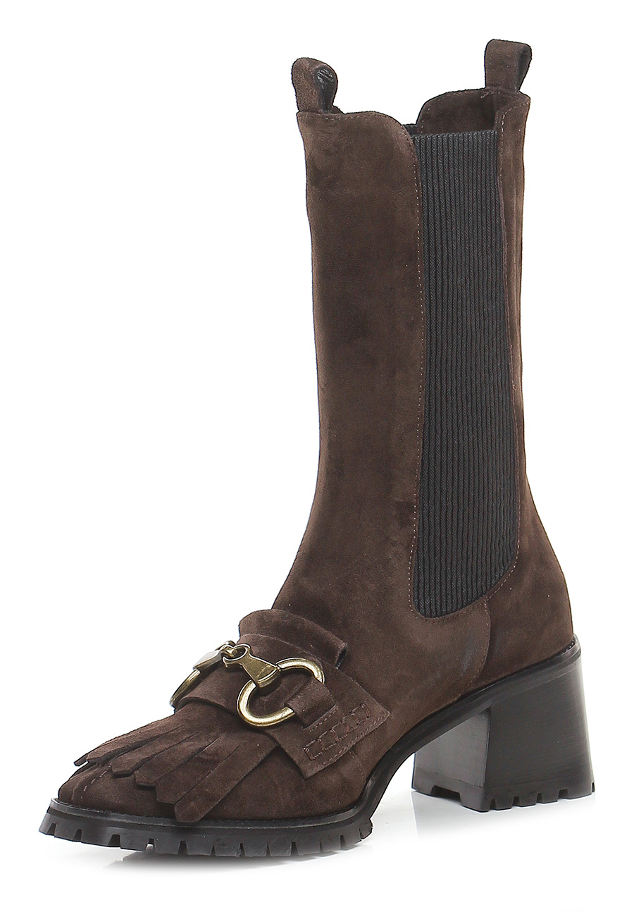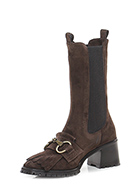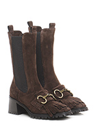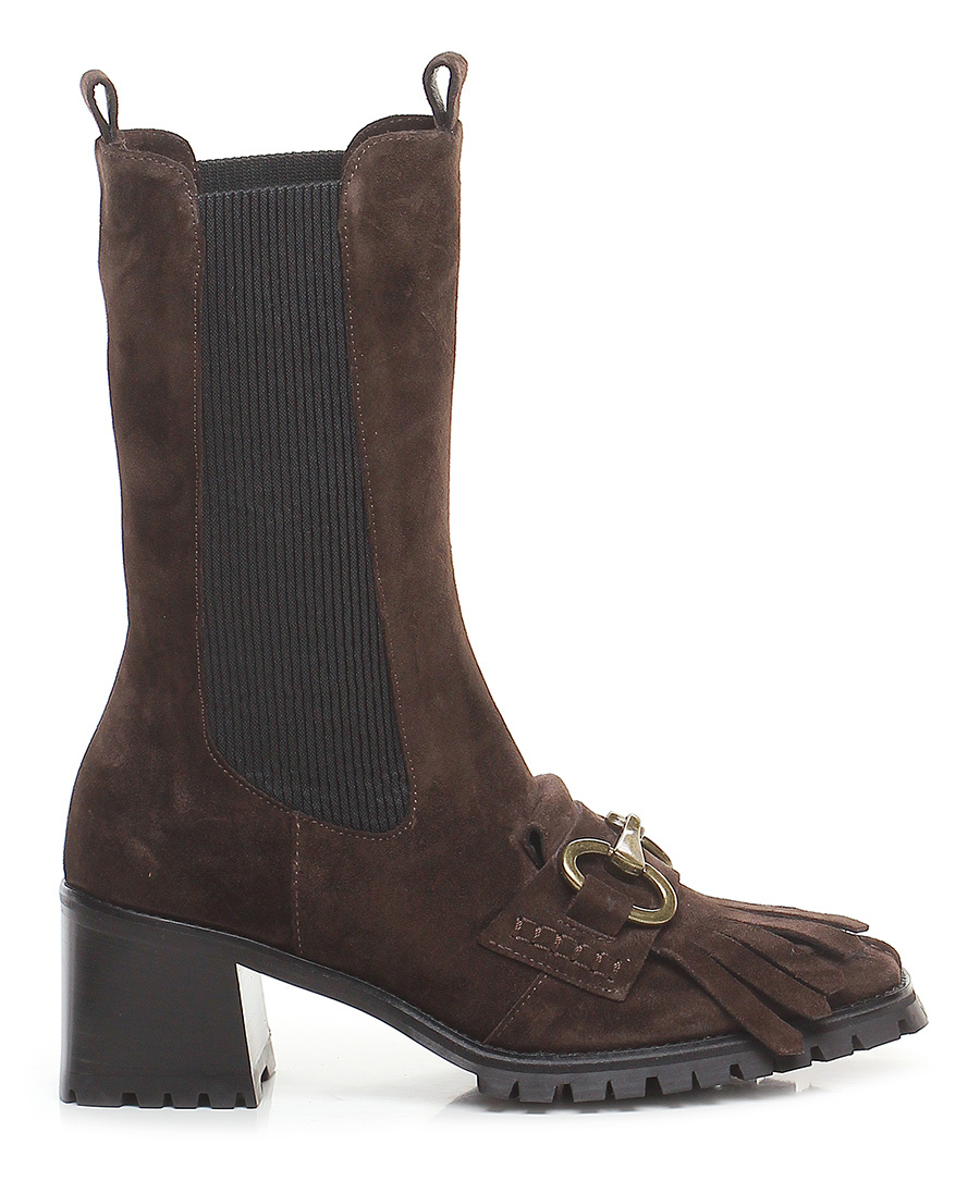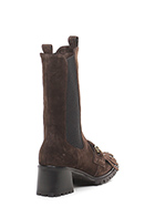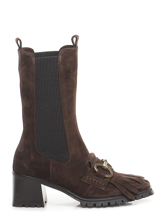 Suede ankle boot with side elasticated inserts. Metal rivet and front flap with fringes. Rubber lug sole. Heel height 65 mm, platform 15 mm with 50 mm ledge.