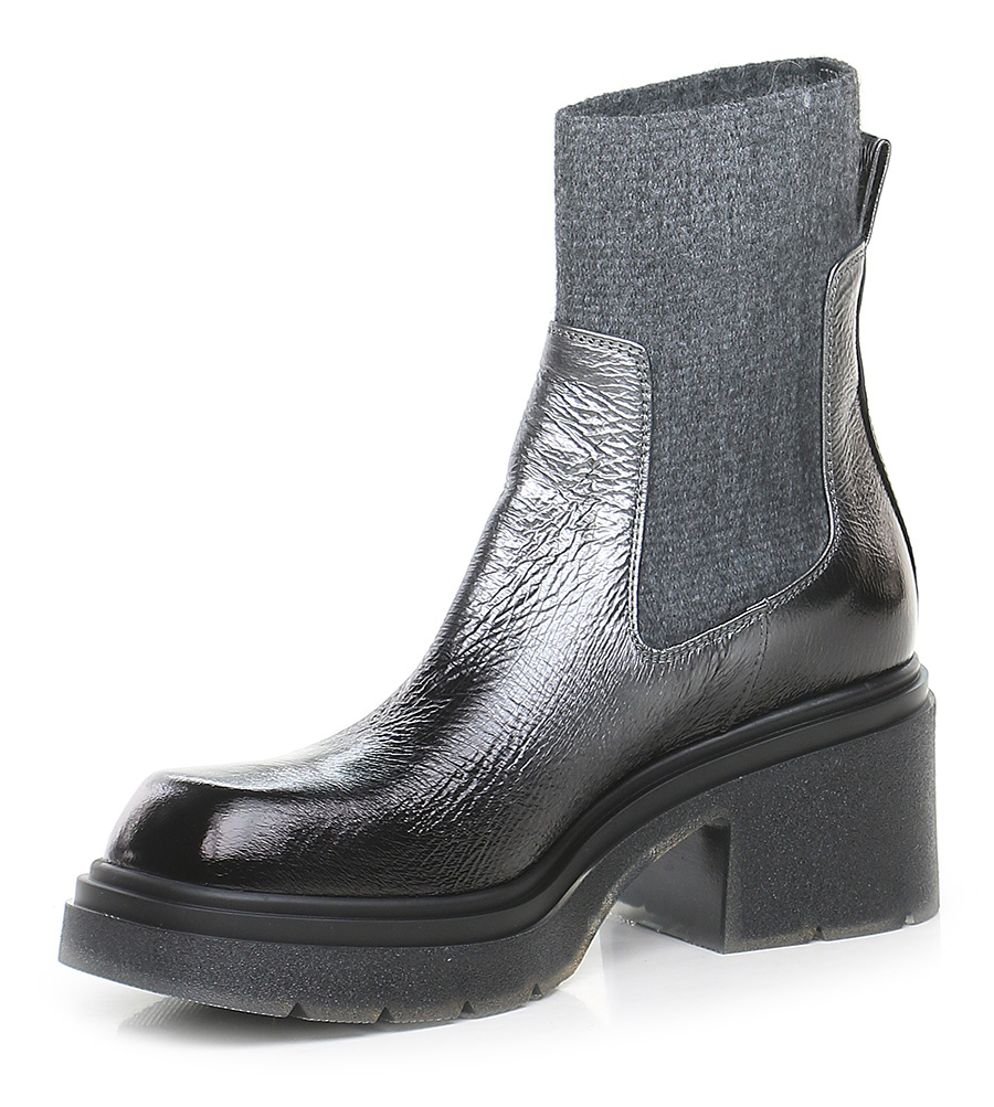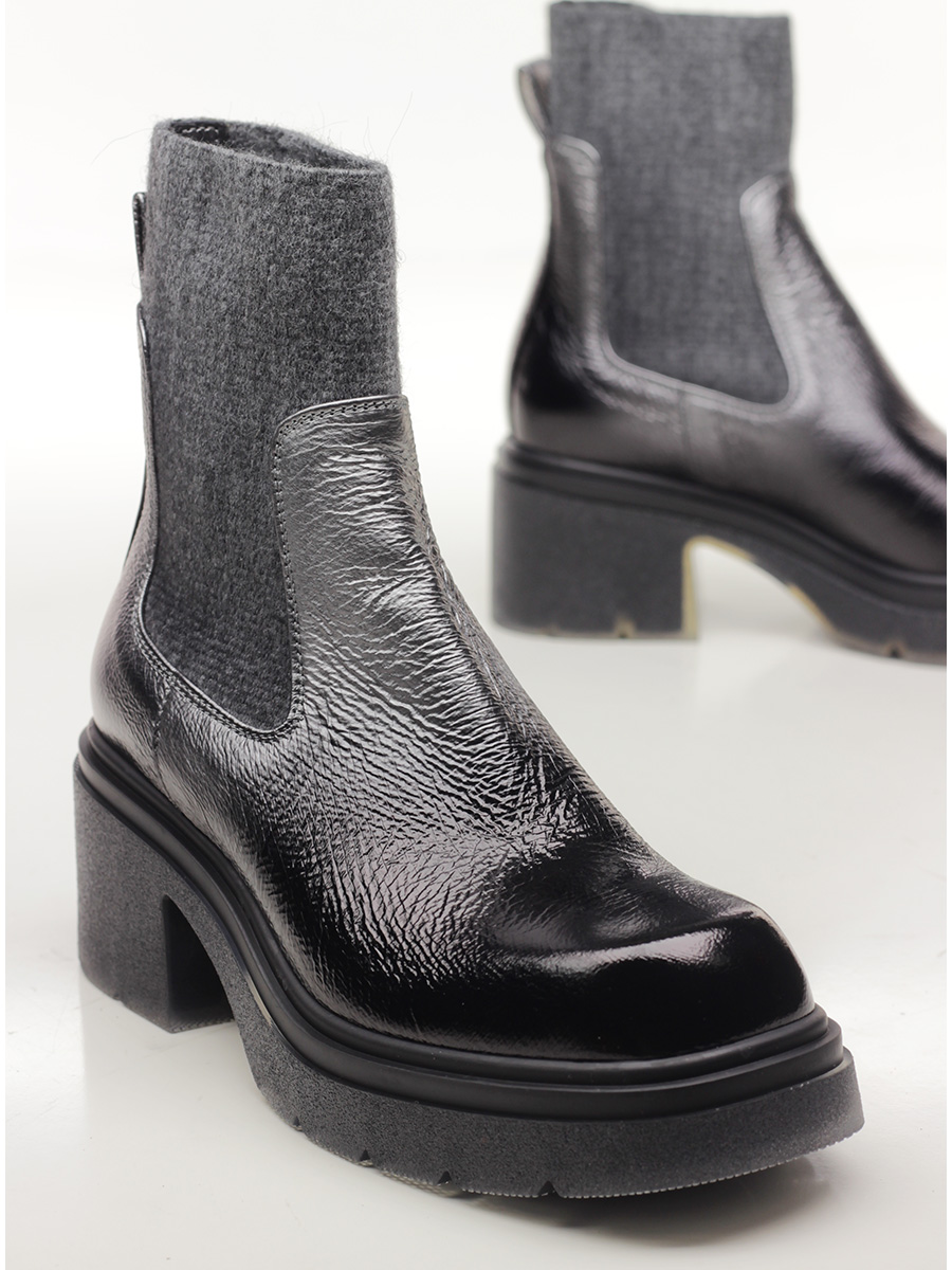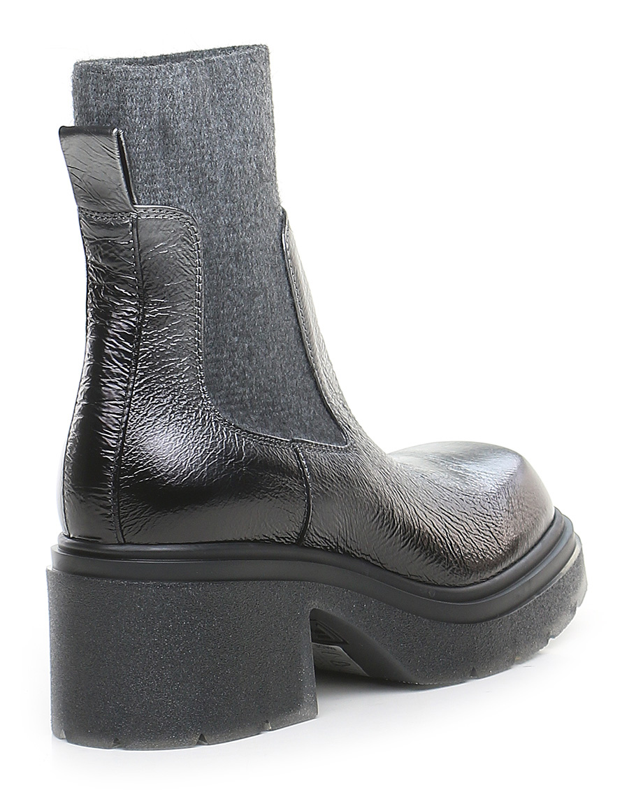 Leather ankle boot with stretch fabric leg. Rubber sole. 70mm heel height, 30mm platform with 40mm ledge.