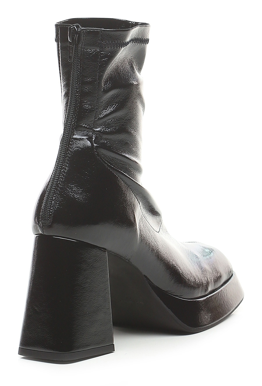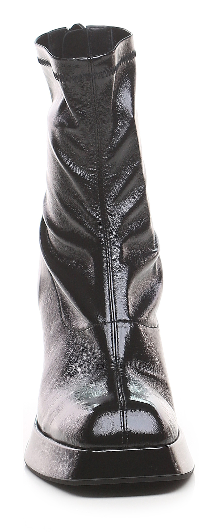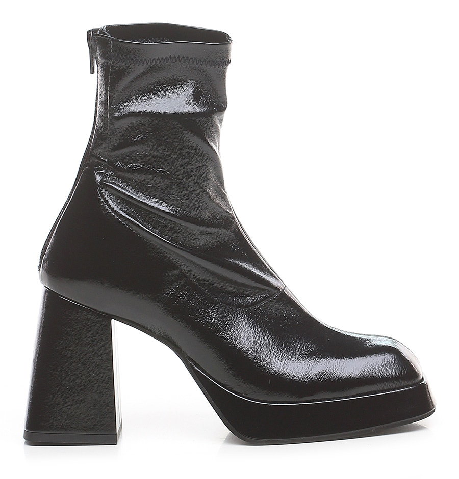 Ankle boot in naplak and naplak stretch with zip on the back and rubber sole. Heel height 90mm, platform 25mm with 65mm ledge. Naplak lined heel.