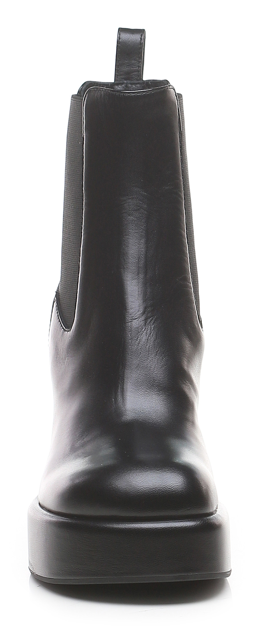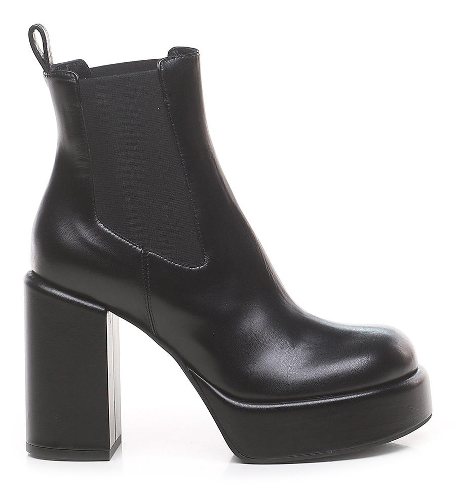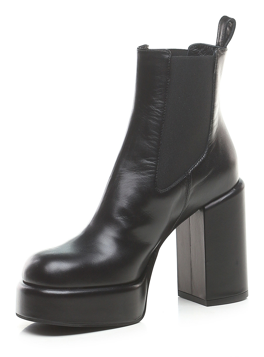 Leather ankle boot with side elasticated inserts and rubber sole. Leather lined heel and platform. Heel height 105mm, platform 35mm with 70mm ledge.