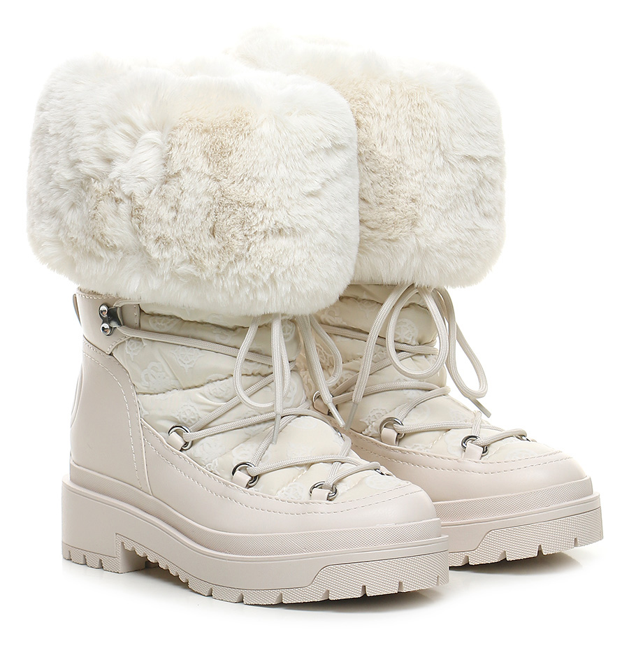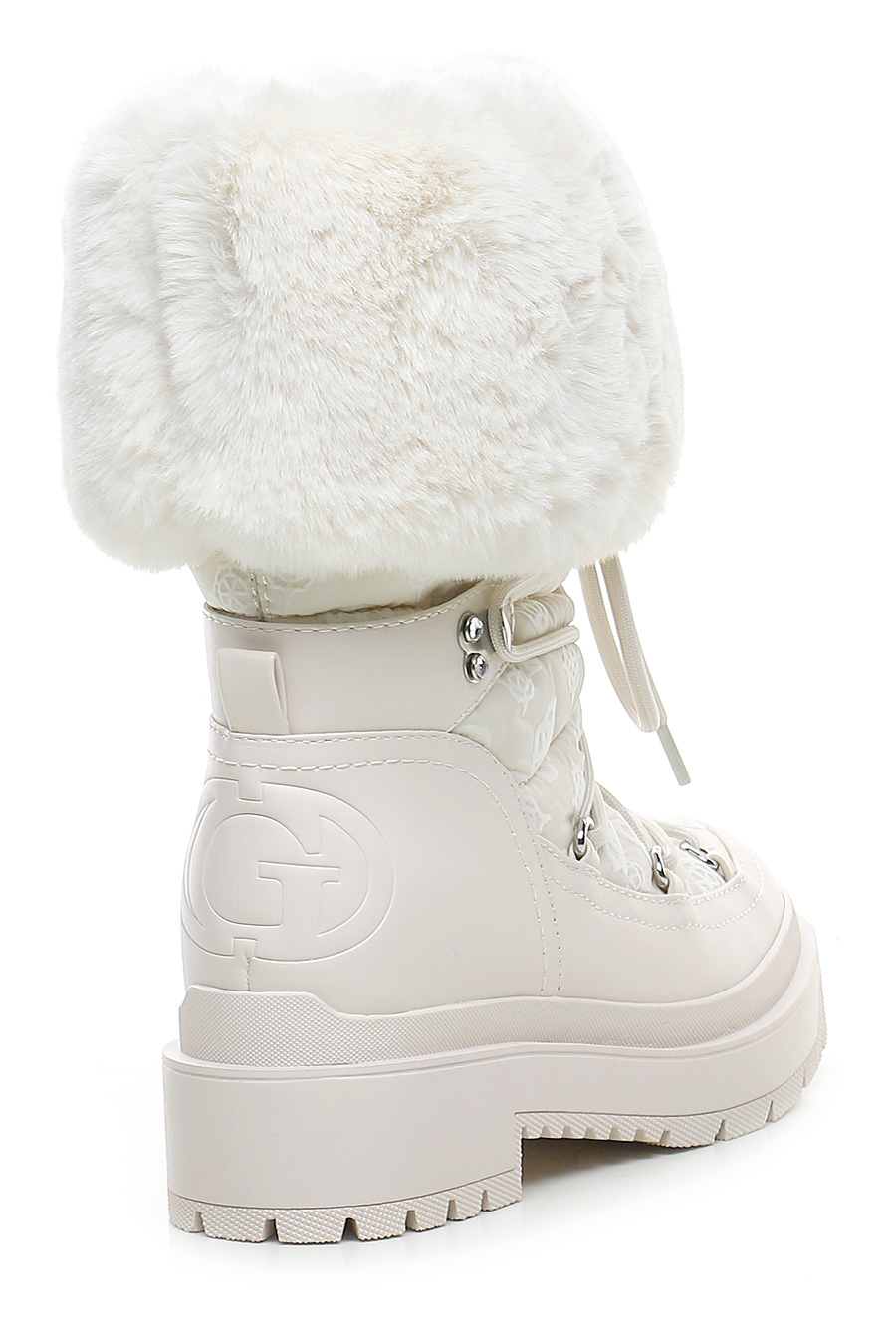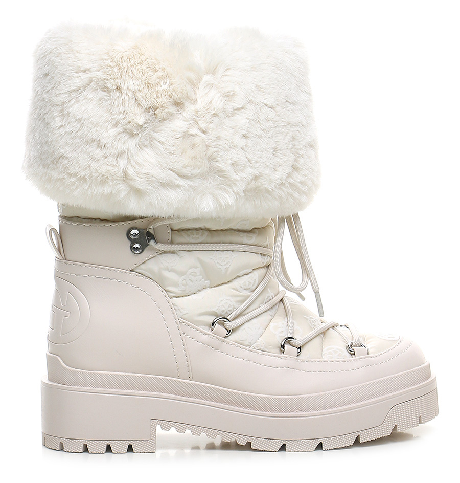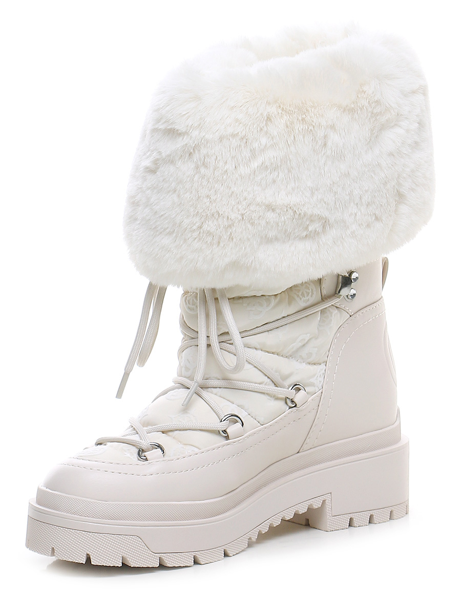 Ankle boot in fabric and leather, lined in fake fur. Rubber sole. 45mm heel height, 25mm platform with 20mm ledge.
