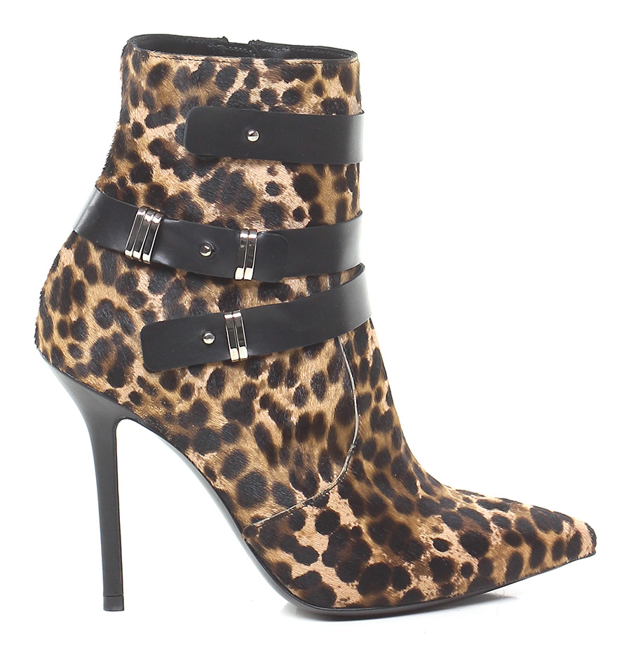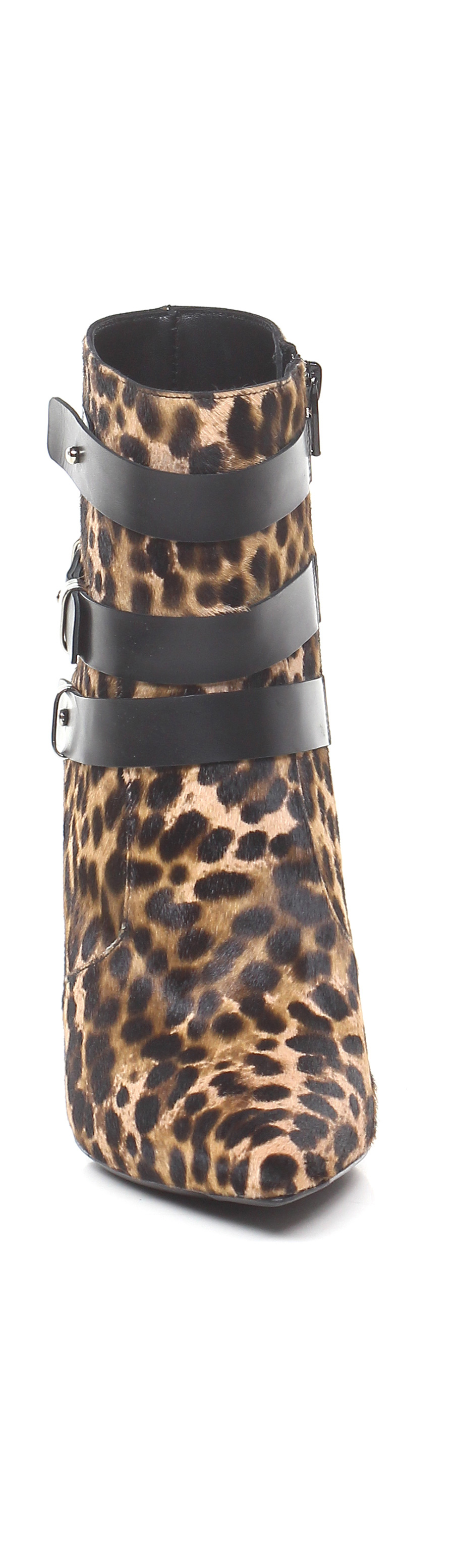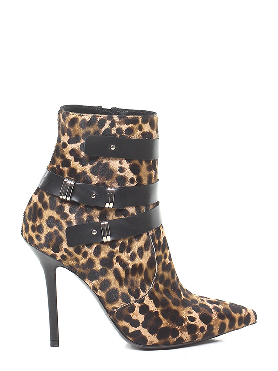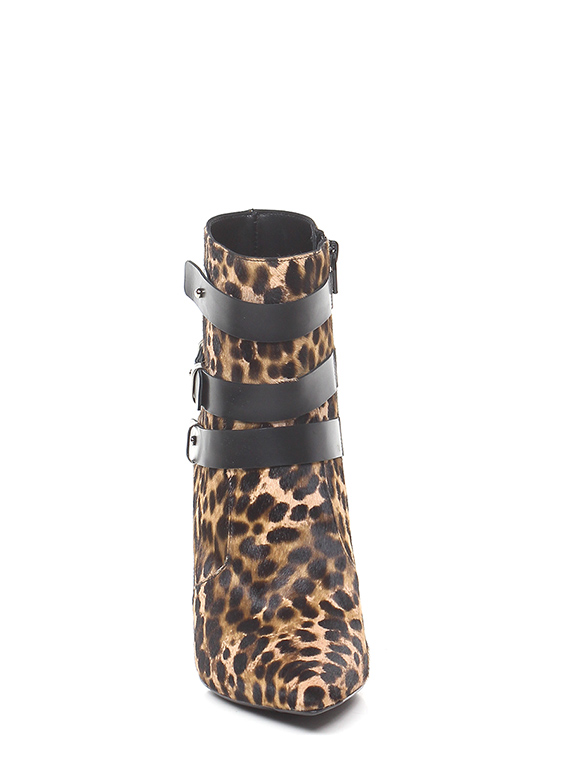 Calf hair and leather ankle boot with front multi-strap and zip on the inside. Leather and rubber sole, 110 heel.