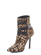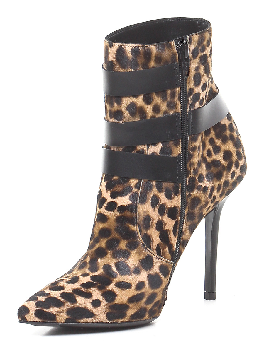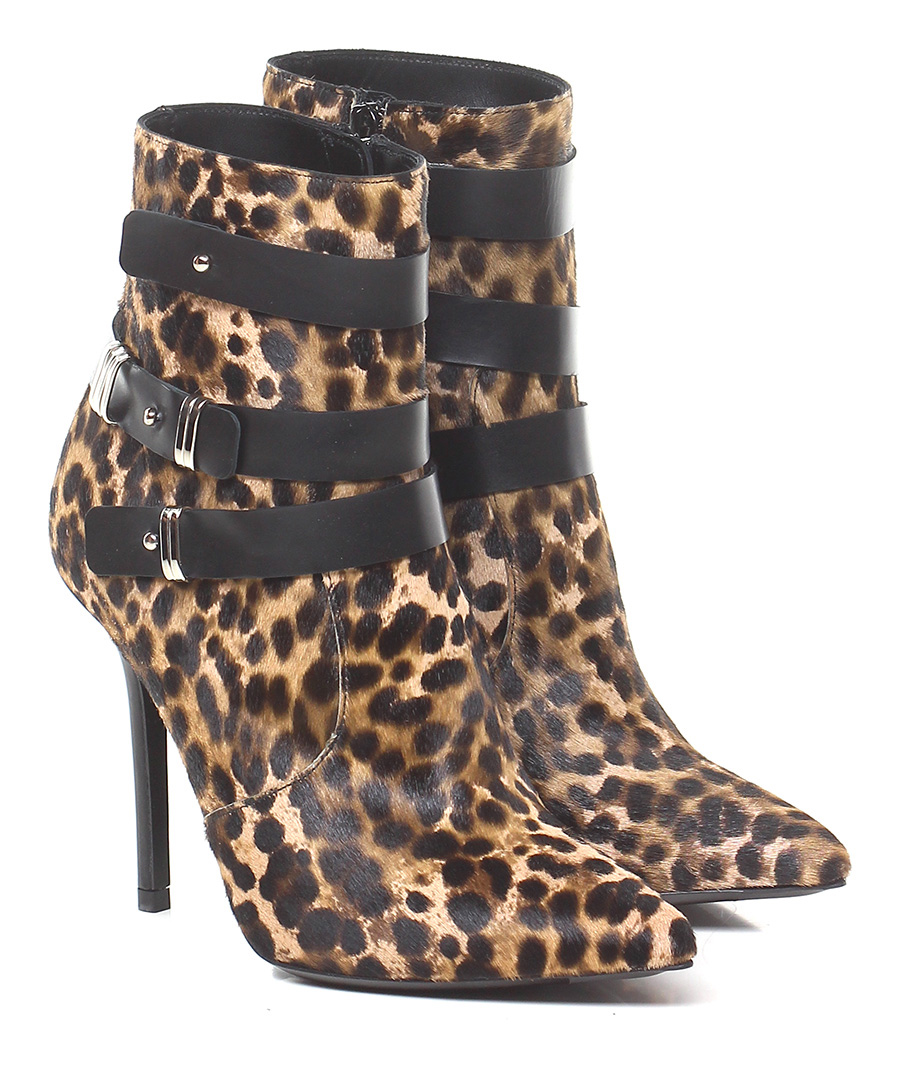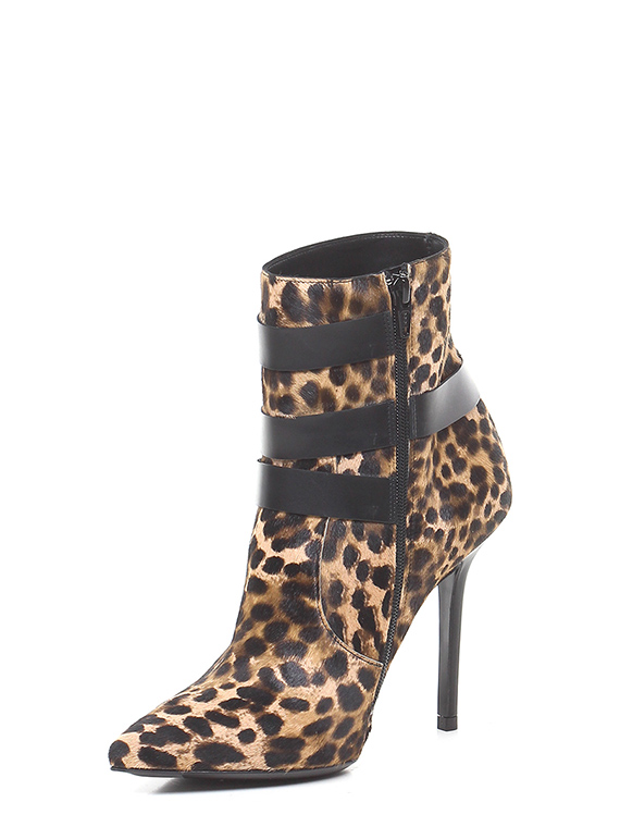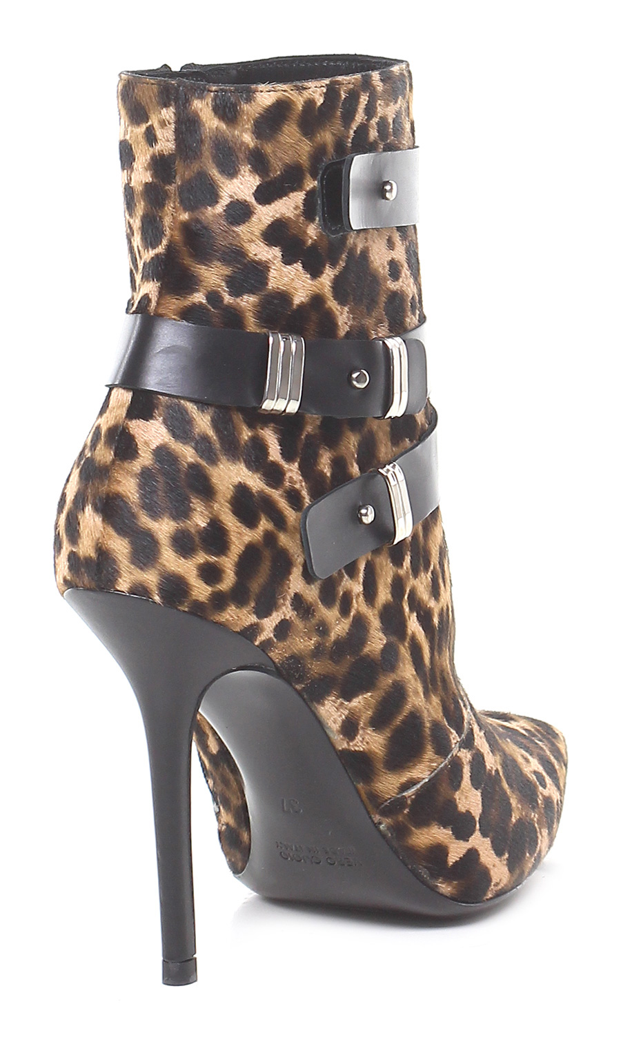 Calf hair and leather ankle boot with front multi-strap and zip on the inside. Leather and rubber sole, 110 heel.